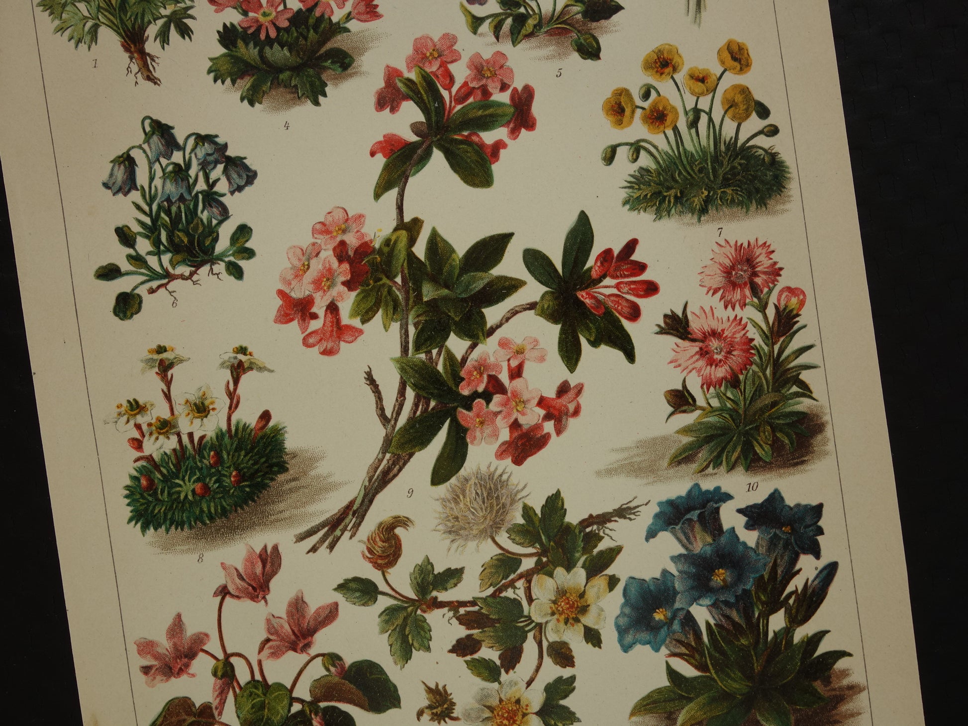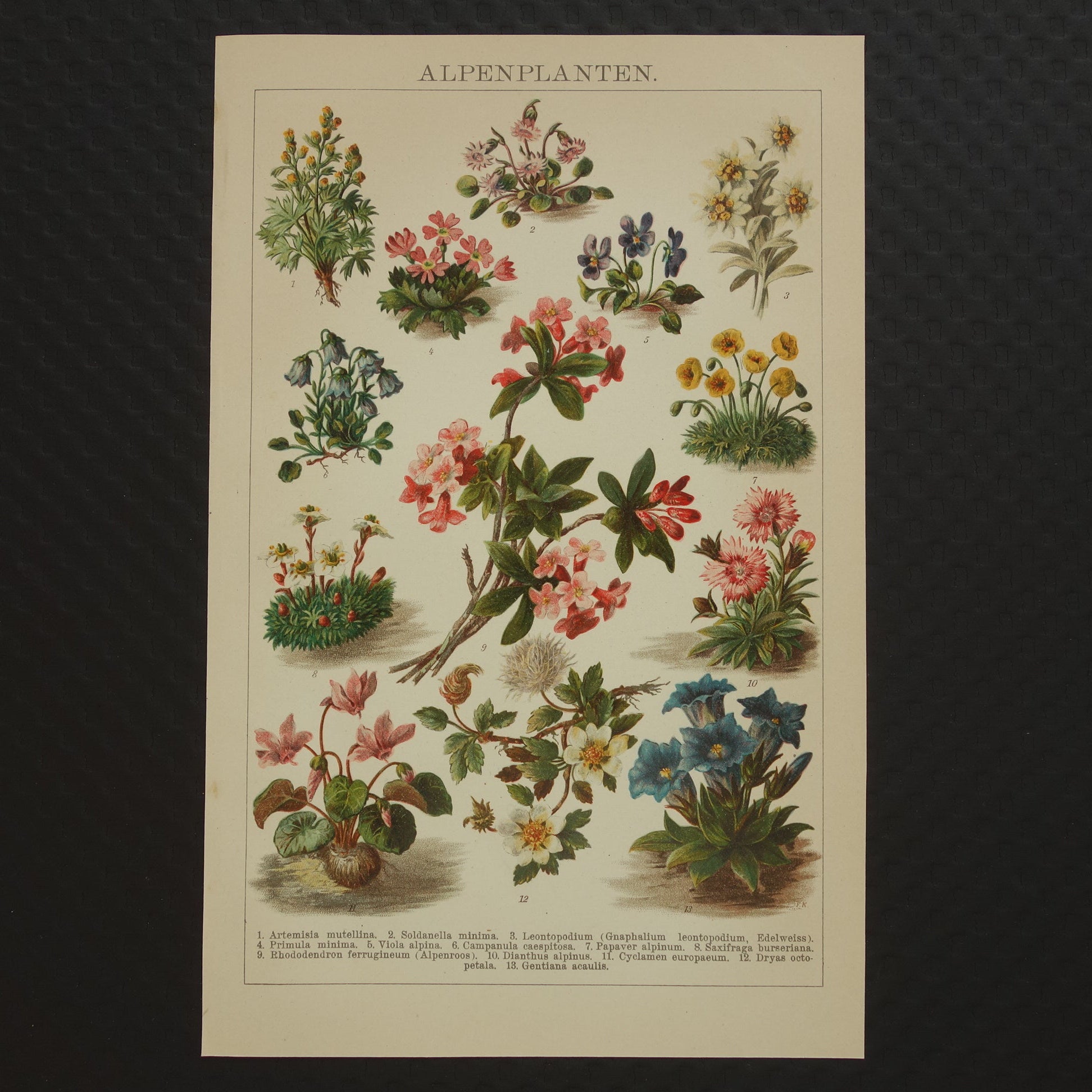 Leuke antieke prent met daarop afbeeldingen van verschillende alpenplanten. De namen van de soorten staan onderaan.