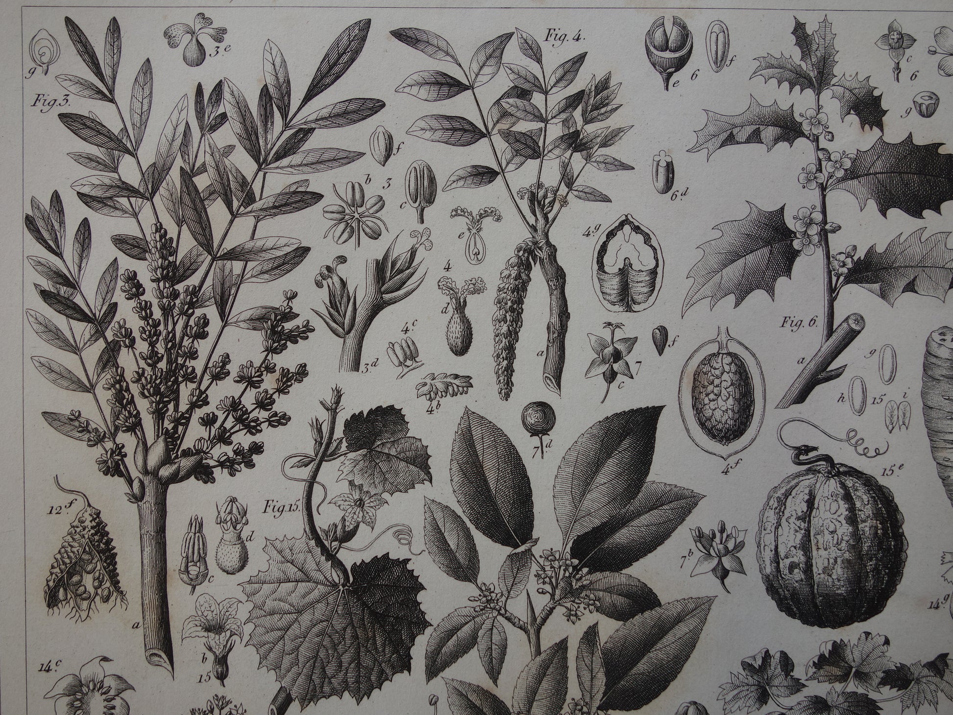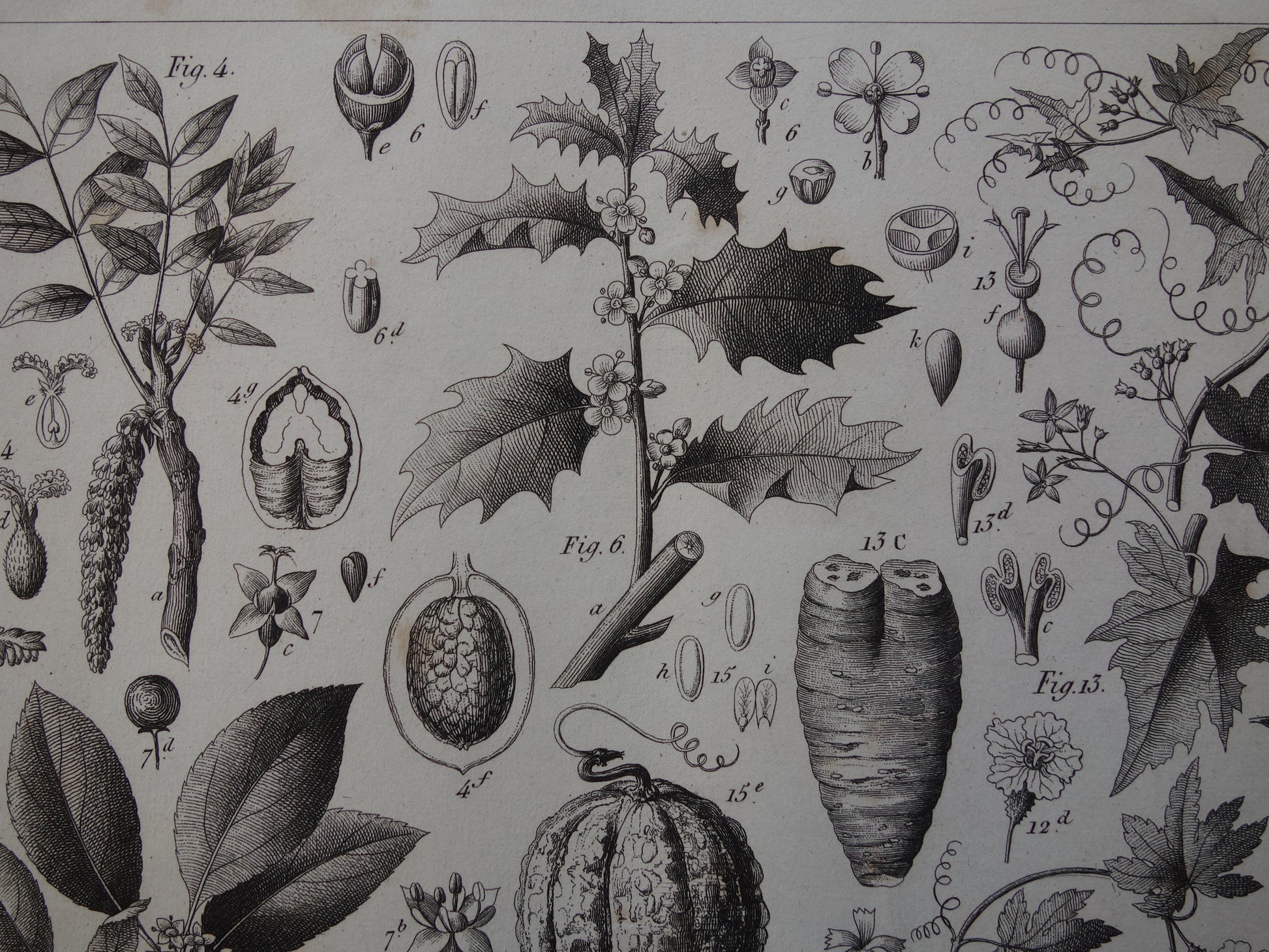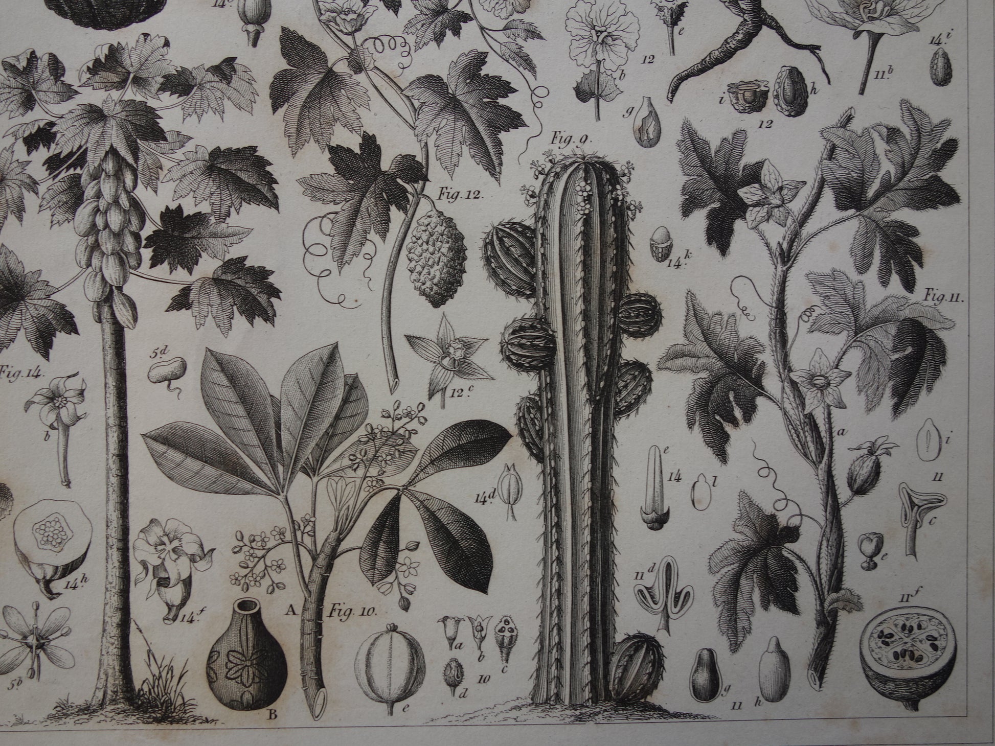 Über 170 Jahre alter botanischer Druck der Wassermelone Original antike Pflanzenillustration Papaya Stechpalme Gummibaum