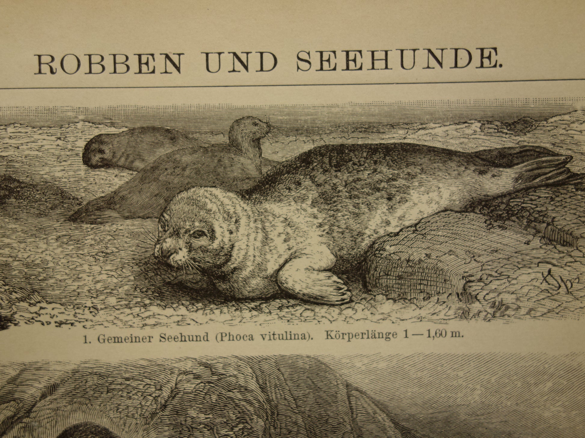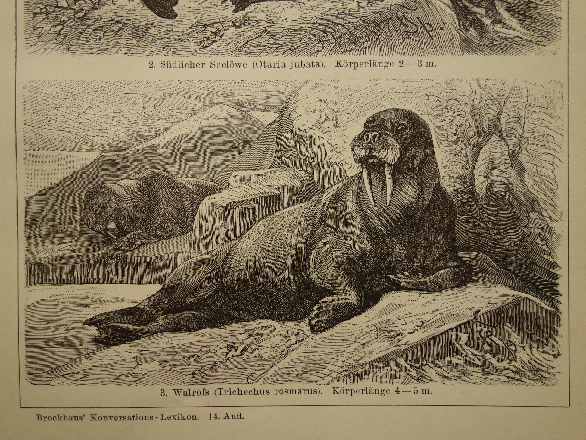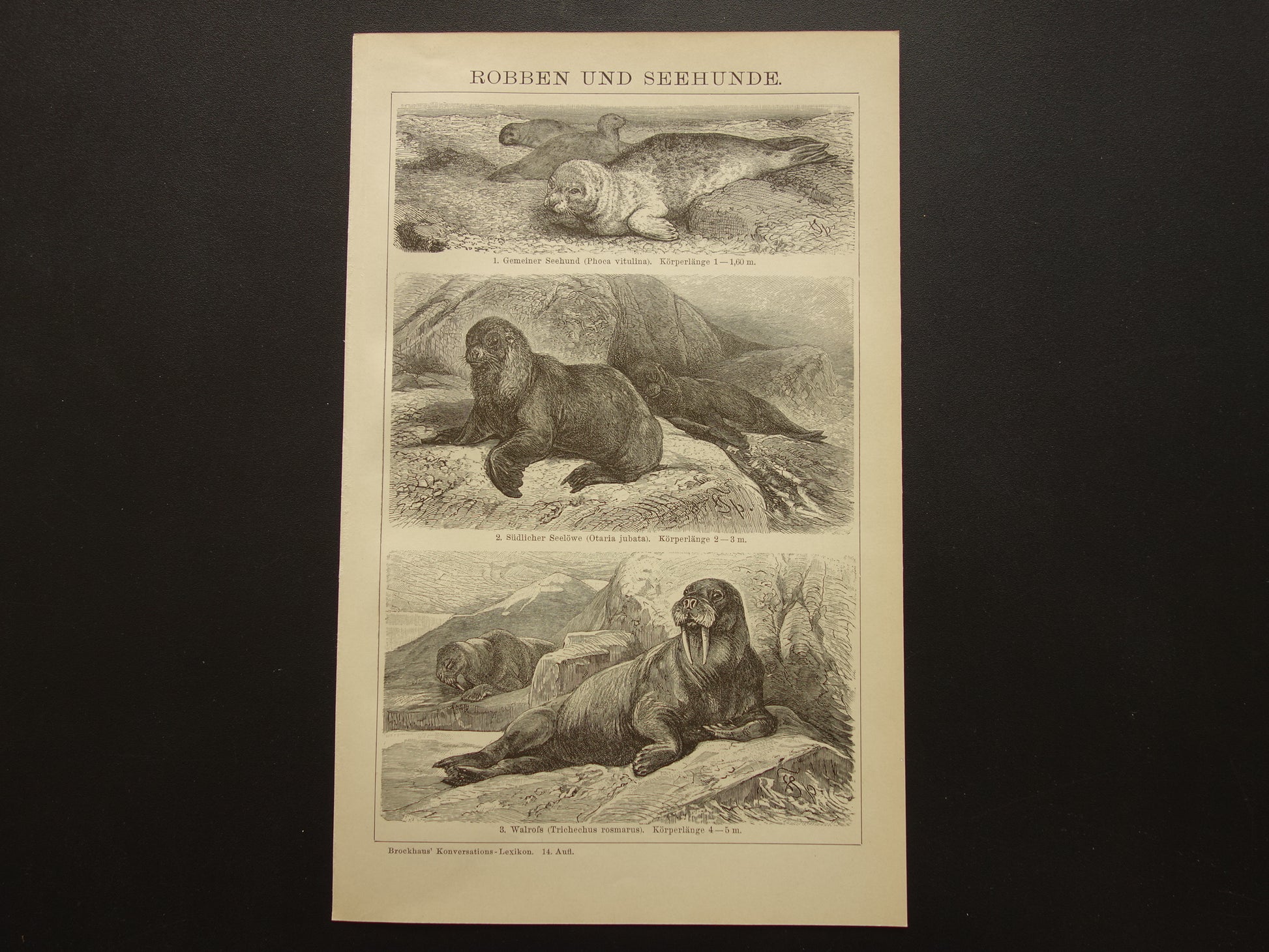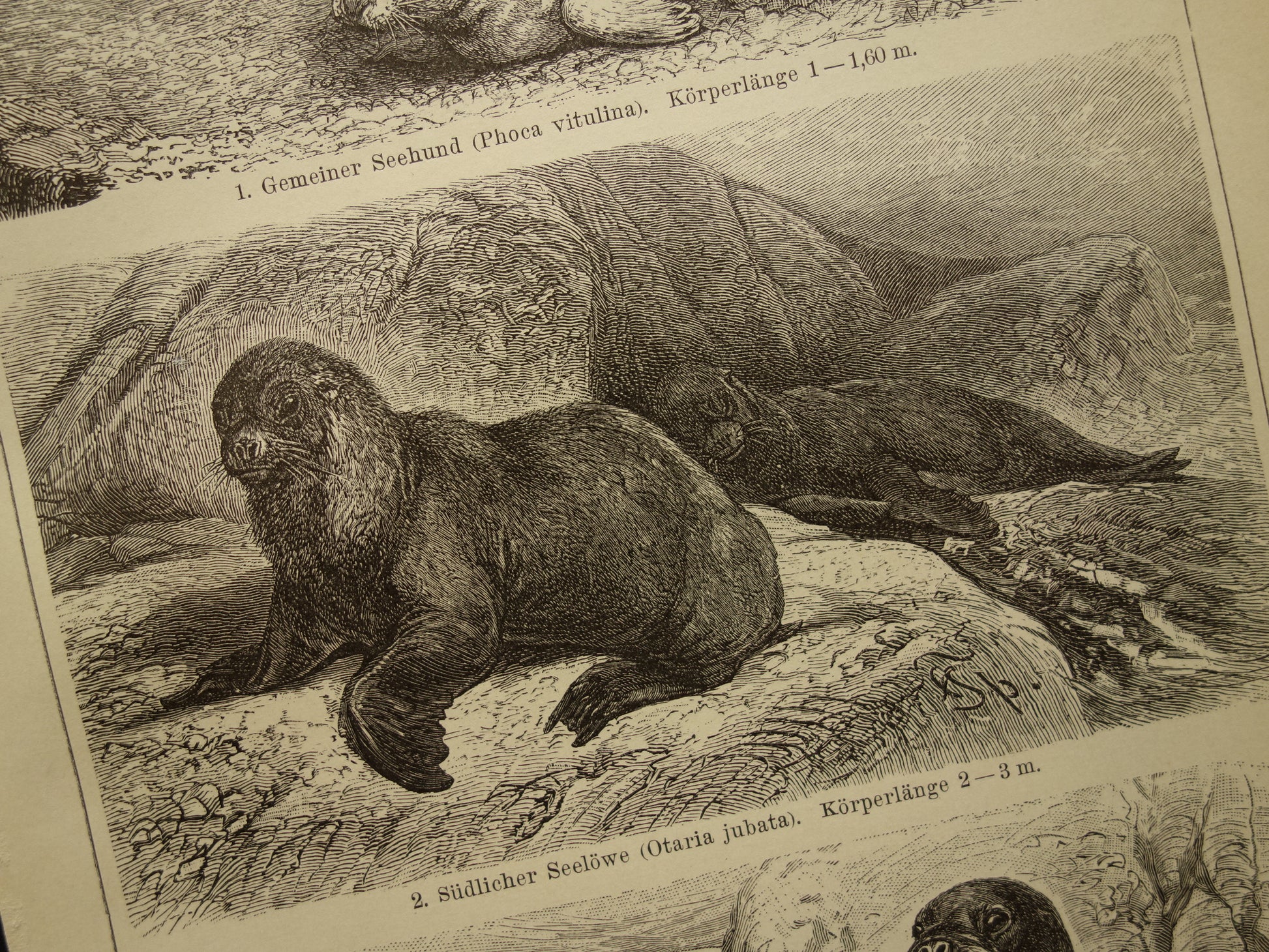 Zum Verkauf steht ein kleiner alter Druck mit Robben (oben), südlichen Seelöwen (Mitte) und Walrossen (unten).