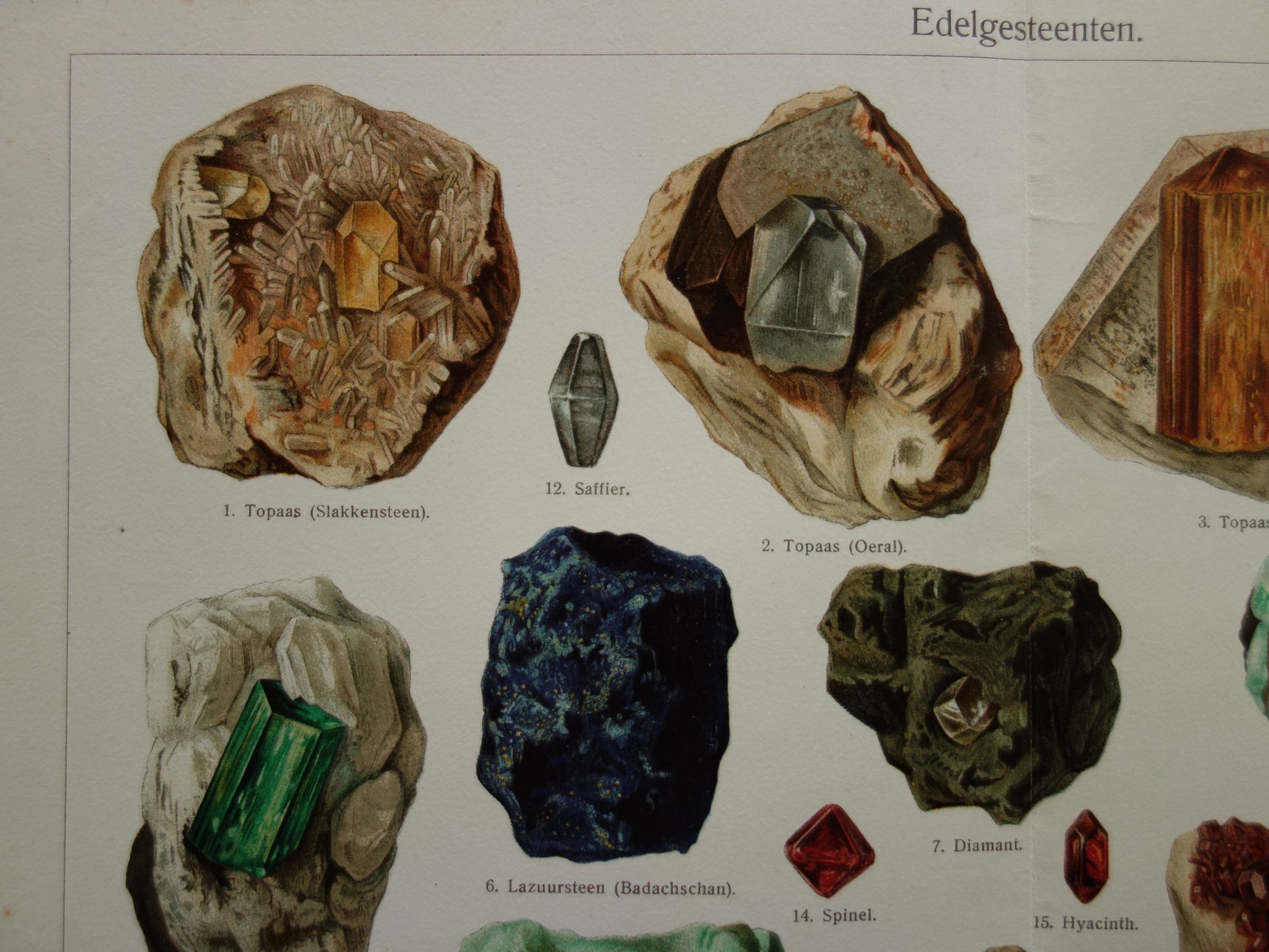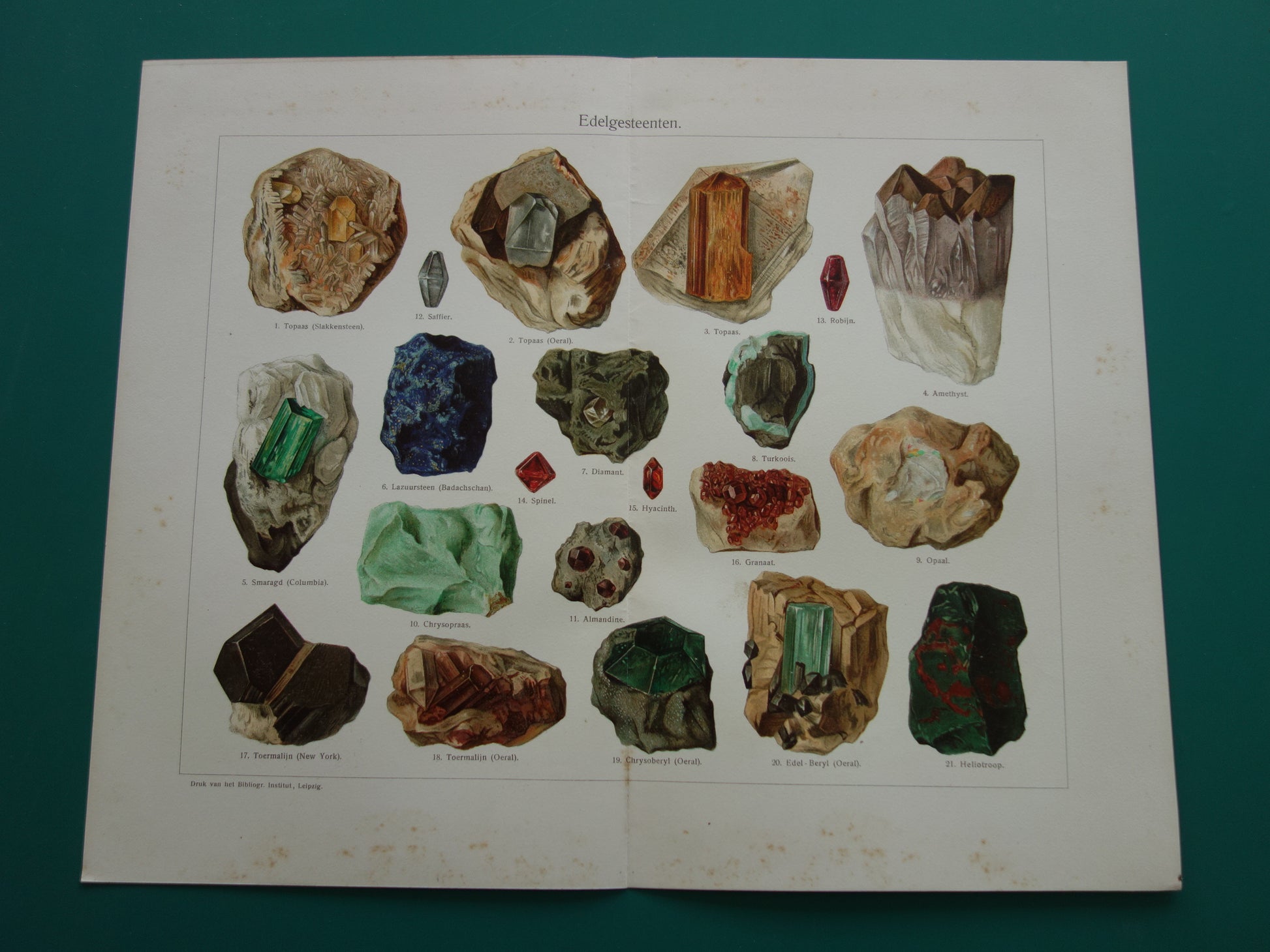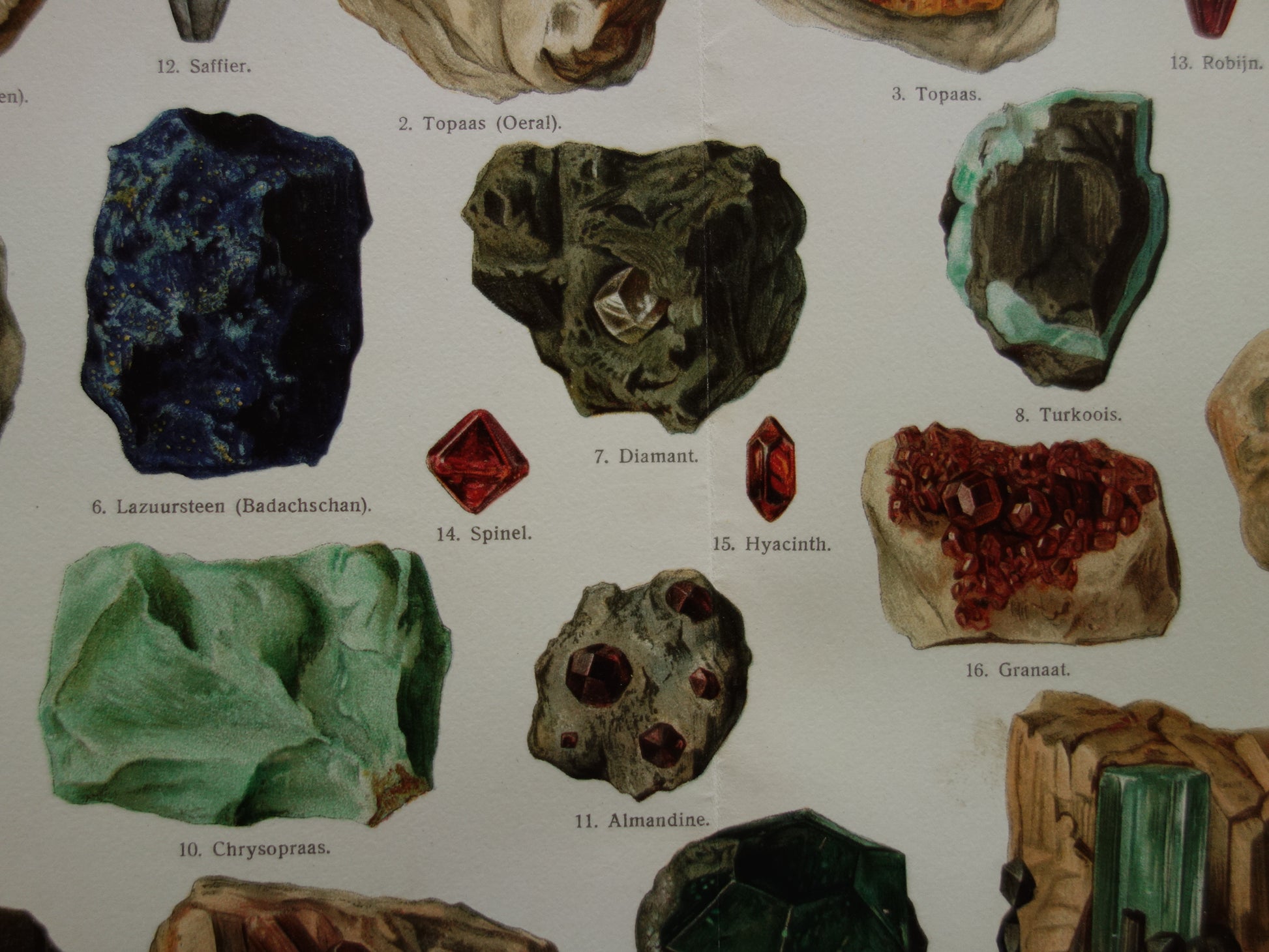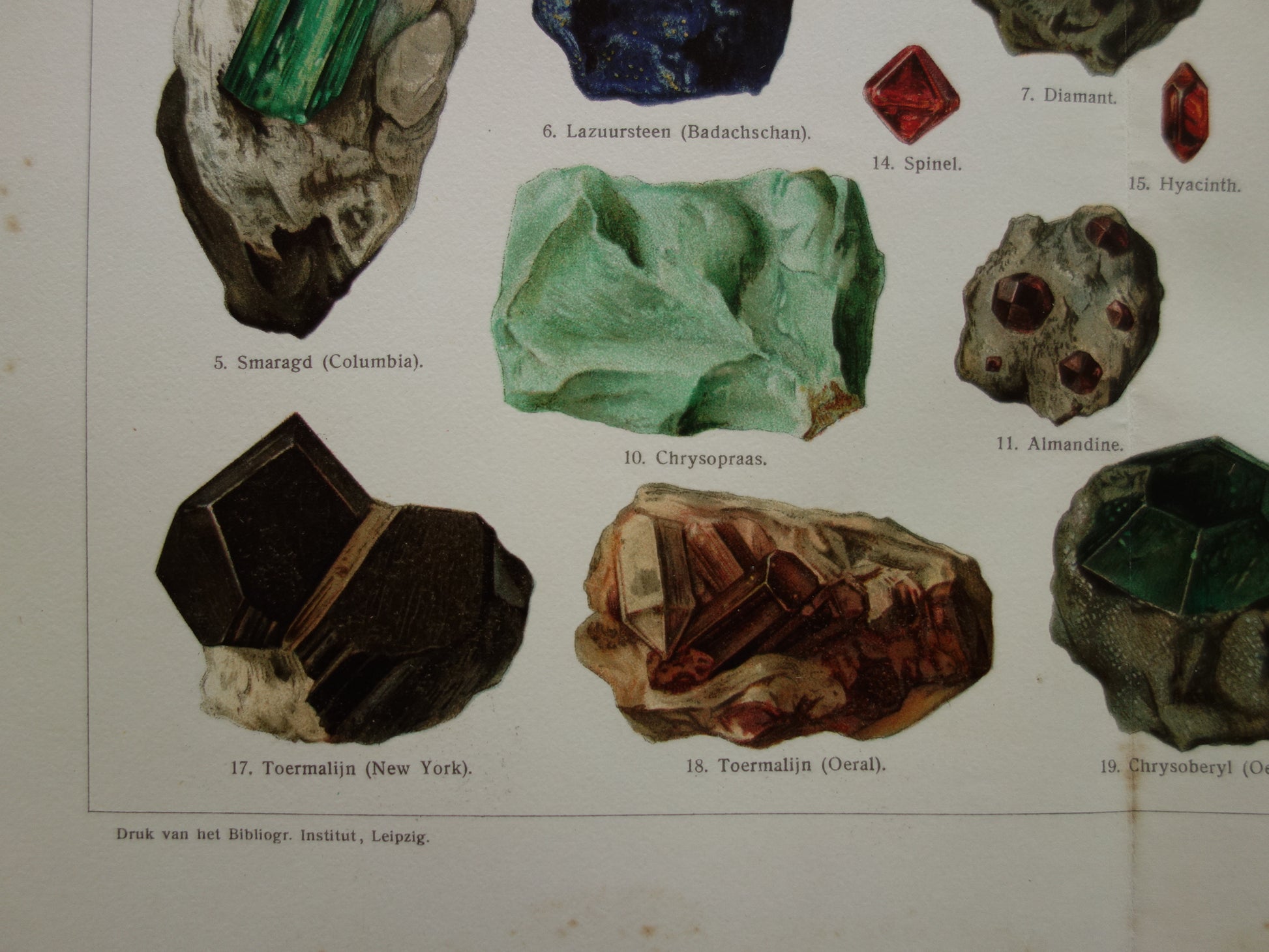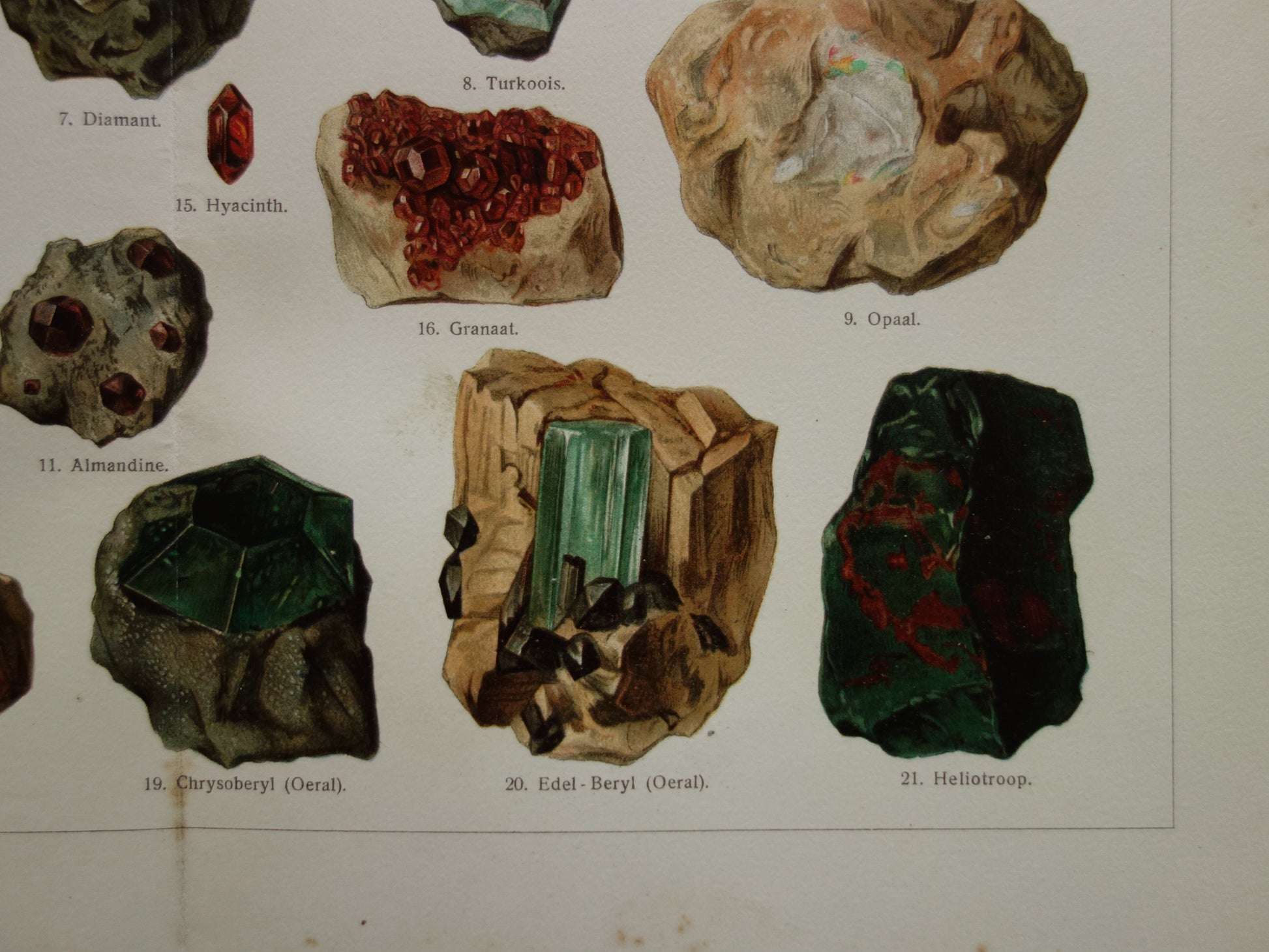 Zum Verkauf steht ein wunderschöner alter niederländischer Druck mit farbenfrohen Abbildungen von Edelsteinen.