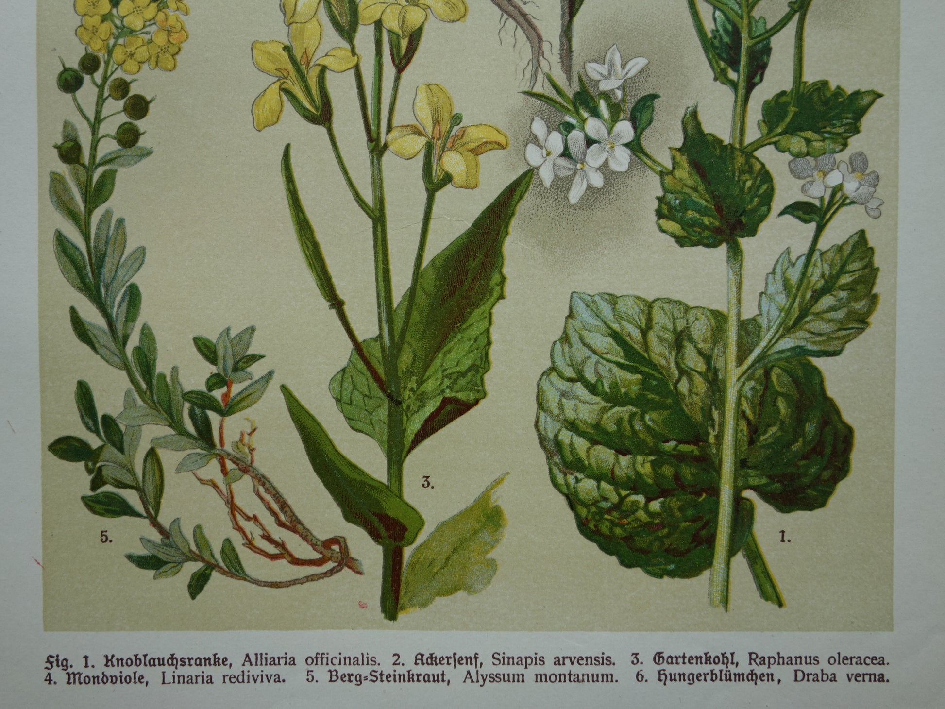 1: Alliaria officinalis / Knoblauch ohne Knoblauch, 2: Sinapis arvensis / Herik, 3: Raphanus oleracea (?), 4: Linaria rediviva / Wilde Judaspensis oder Mondblume, 5: Alyssum montanum / Schildsamen, 6: Draba verna / Frühaufsteher
