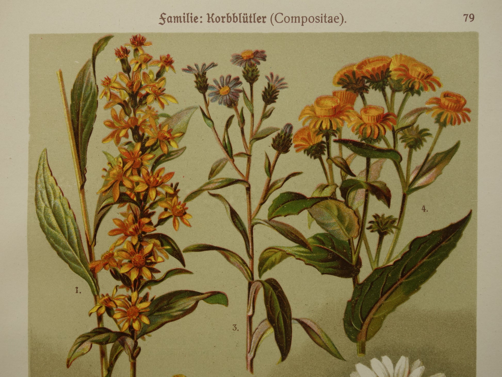 Zwei antike deutsche botanische Drucke mit Blumenmotiven, darunter Gänseblümchen und Ringelblumen. Die deutschen und lateinischen Namen der verschiedenen Arten sind am unteren Rand aufgeführt. Gedruckt auf festem Papier mit breiten Rändern, eignen sie sich ideal zum Einrahmen.