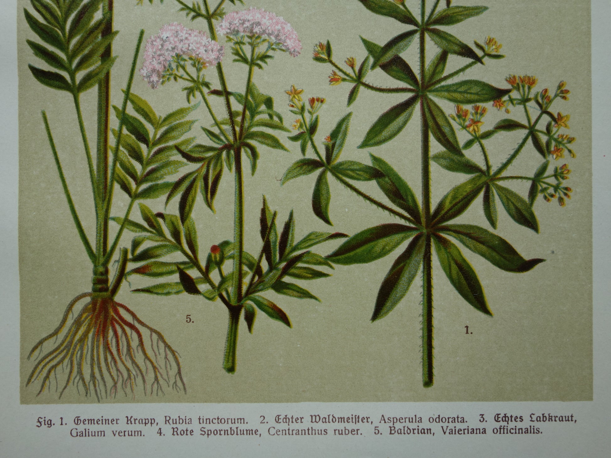 Zum Verkauf steht ein wunderschöner, alter deutscher botanischer Druck mit farbenfrohen Abbildungen verschiedener Pflanzen, darunter Baldrian und Gelbes Labkraut. Die deutschen und lateinischen Namen der Arten sind unten aufgeführt. Dieser originale antike Druck aus dem Jahr 1911 hat breite Ränder und eignet sich daher hervorragend zum Einrahmen.