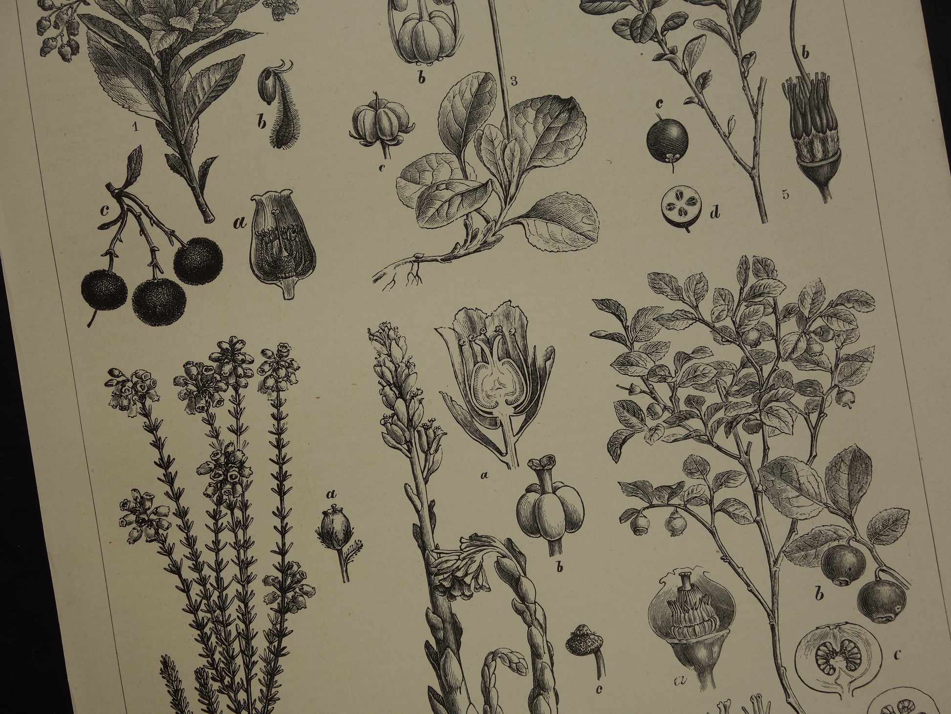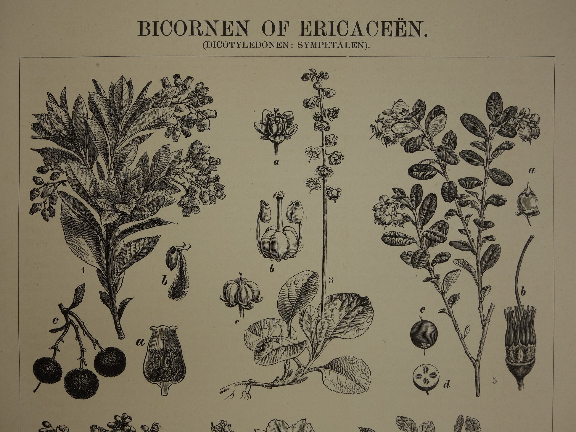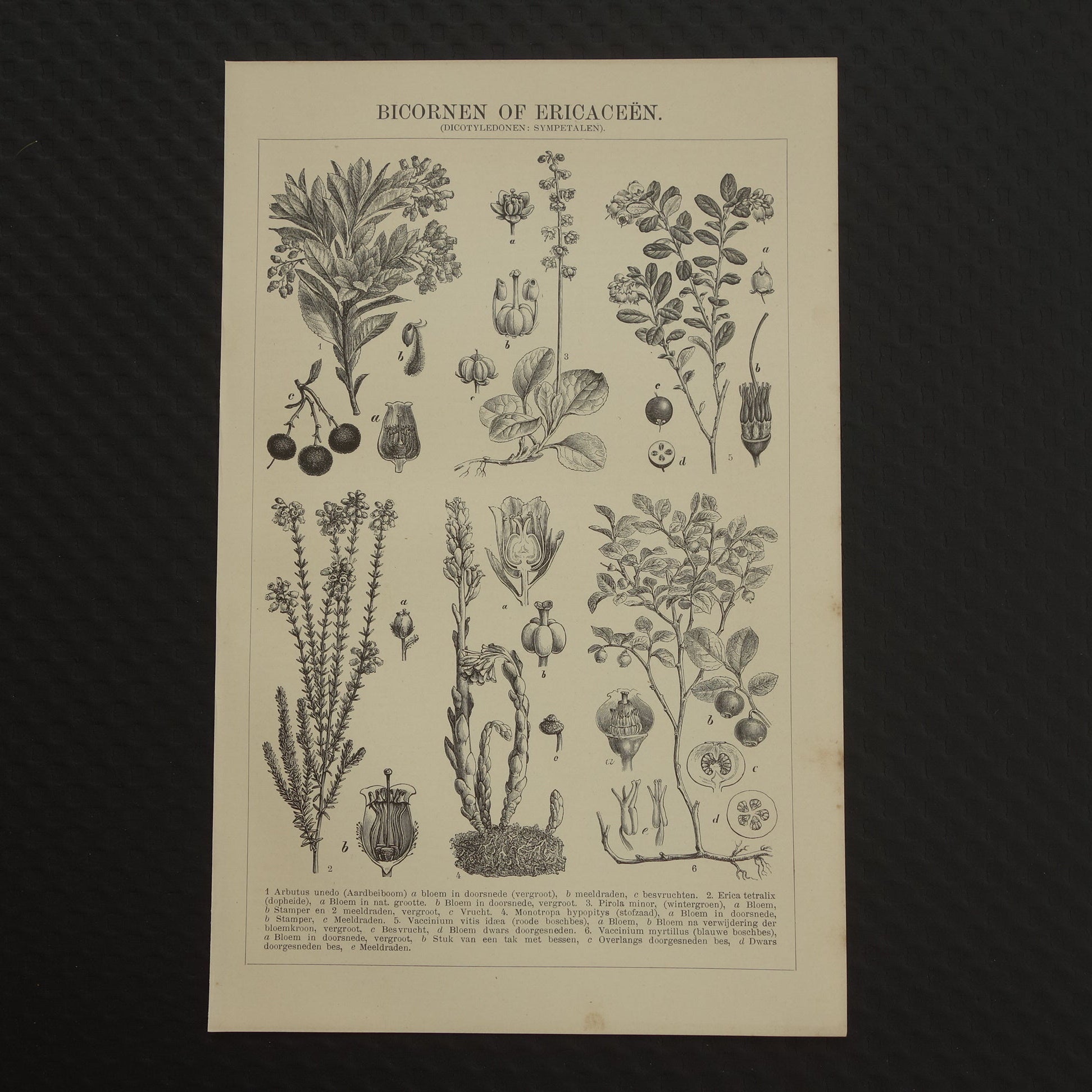 Te koop is kleine oude Nederlandse botanische prent met daarop afbeeldingen van planten uit de Ericaceae familie. Afgebeeld staan de aardbeiboom, wintergroen, stofzaad, dopheide en de blauwe en rode bosbes.