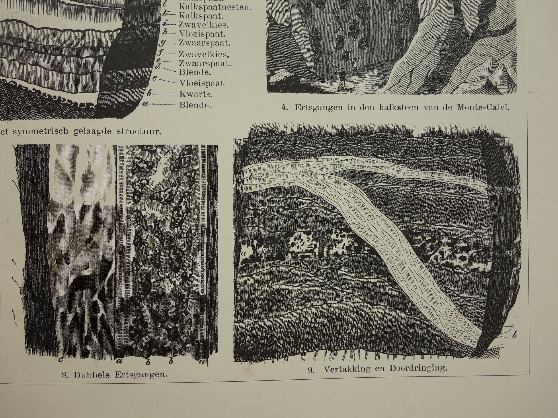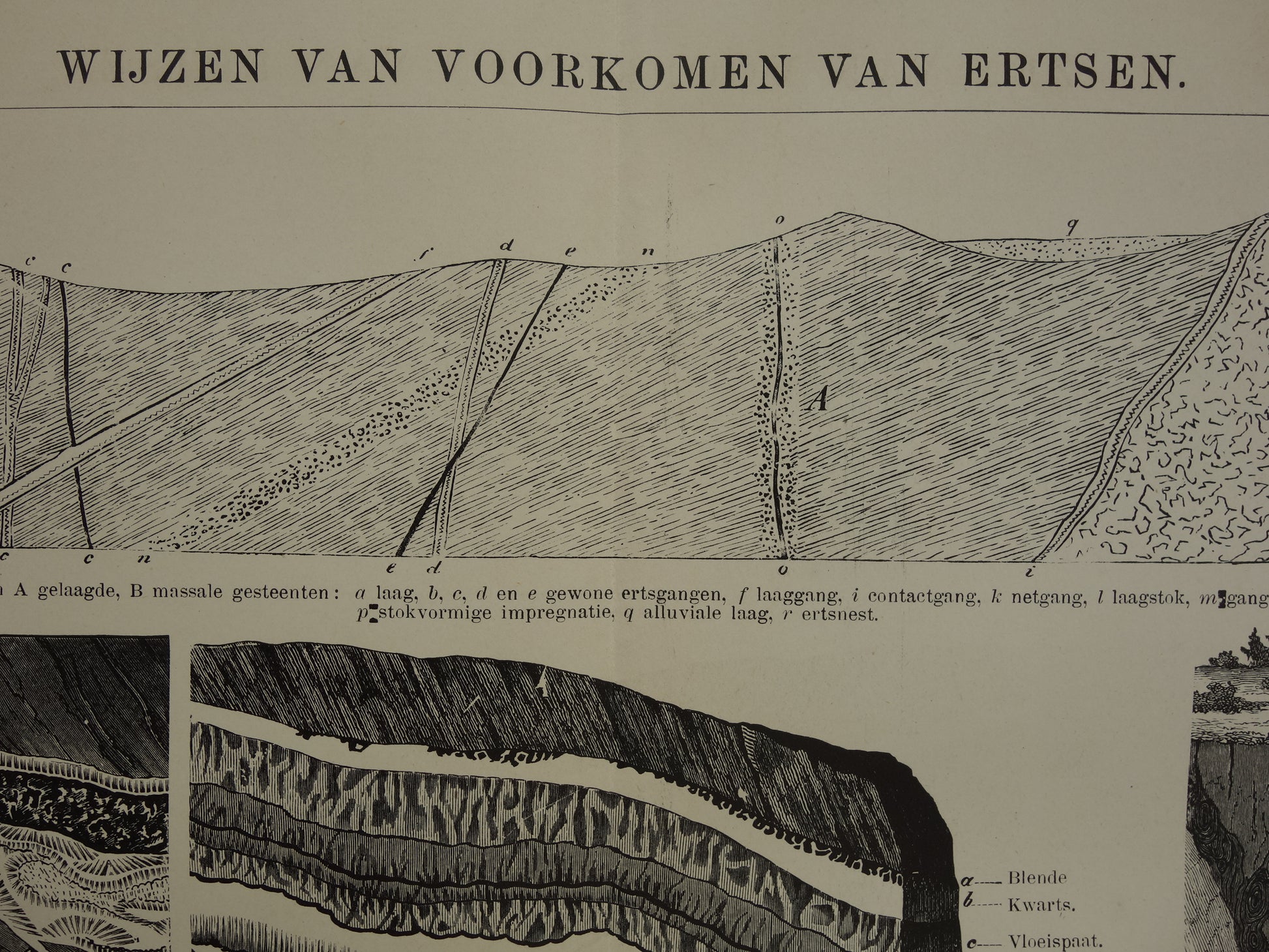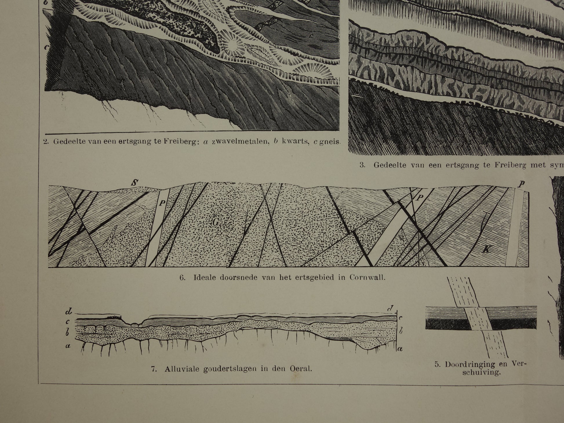 Erts Oude geologie prent uit 1907 over Aardlagen Ertsgangen Ertsaders Originele antieke Nederlandse geologie illustratie