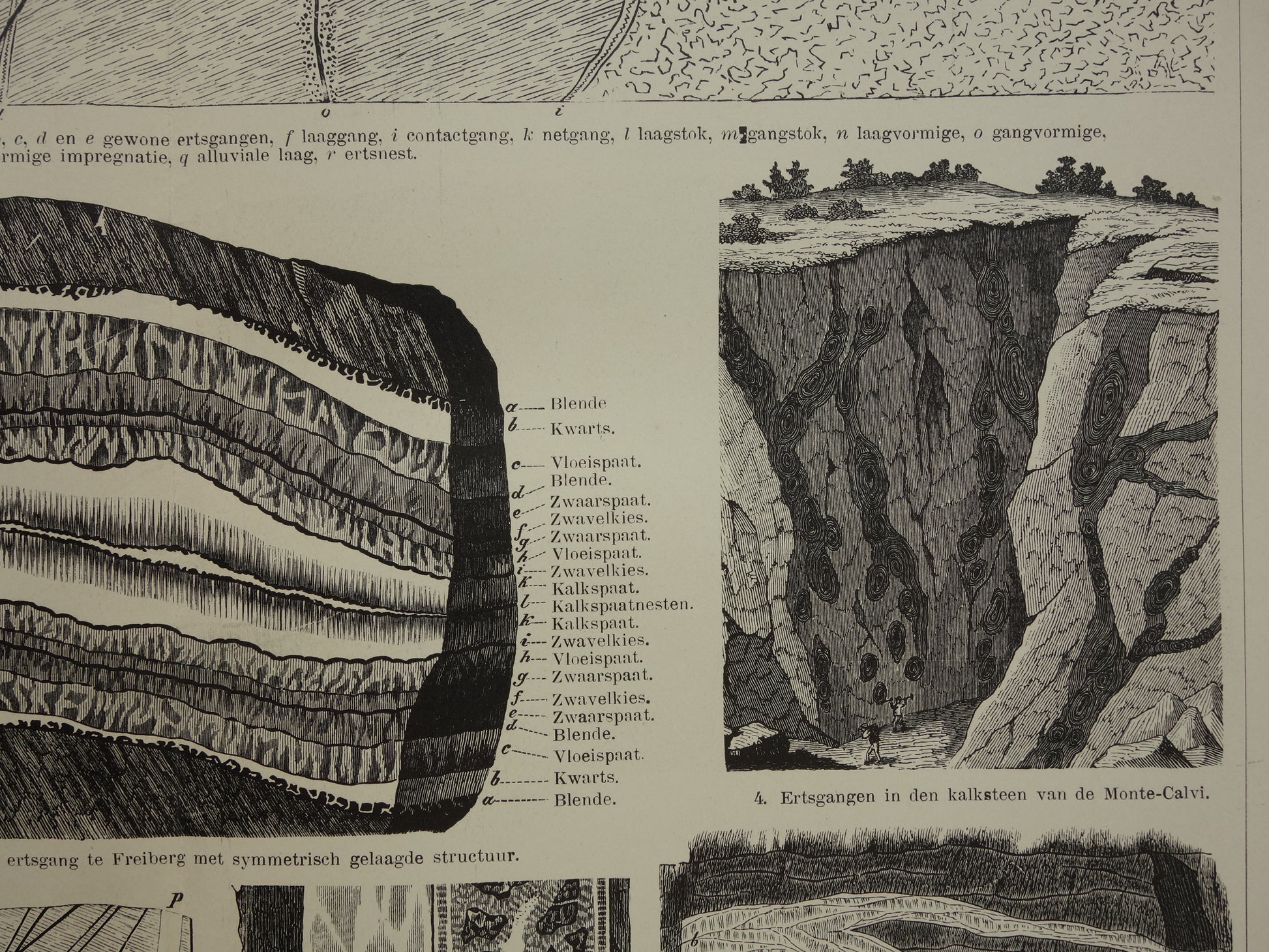 Te koop is een mooie, oude Nederlandse geologie prent over aardlagen,ertsgangen/ertsaders en mijnbouw. Met ruime marges en dus heel geschikt om in te lijsten.