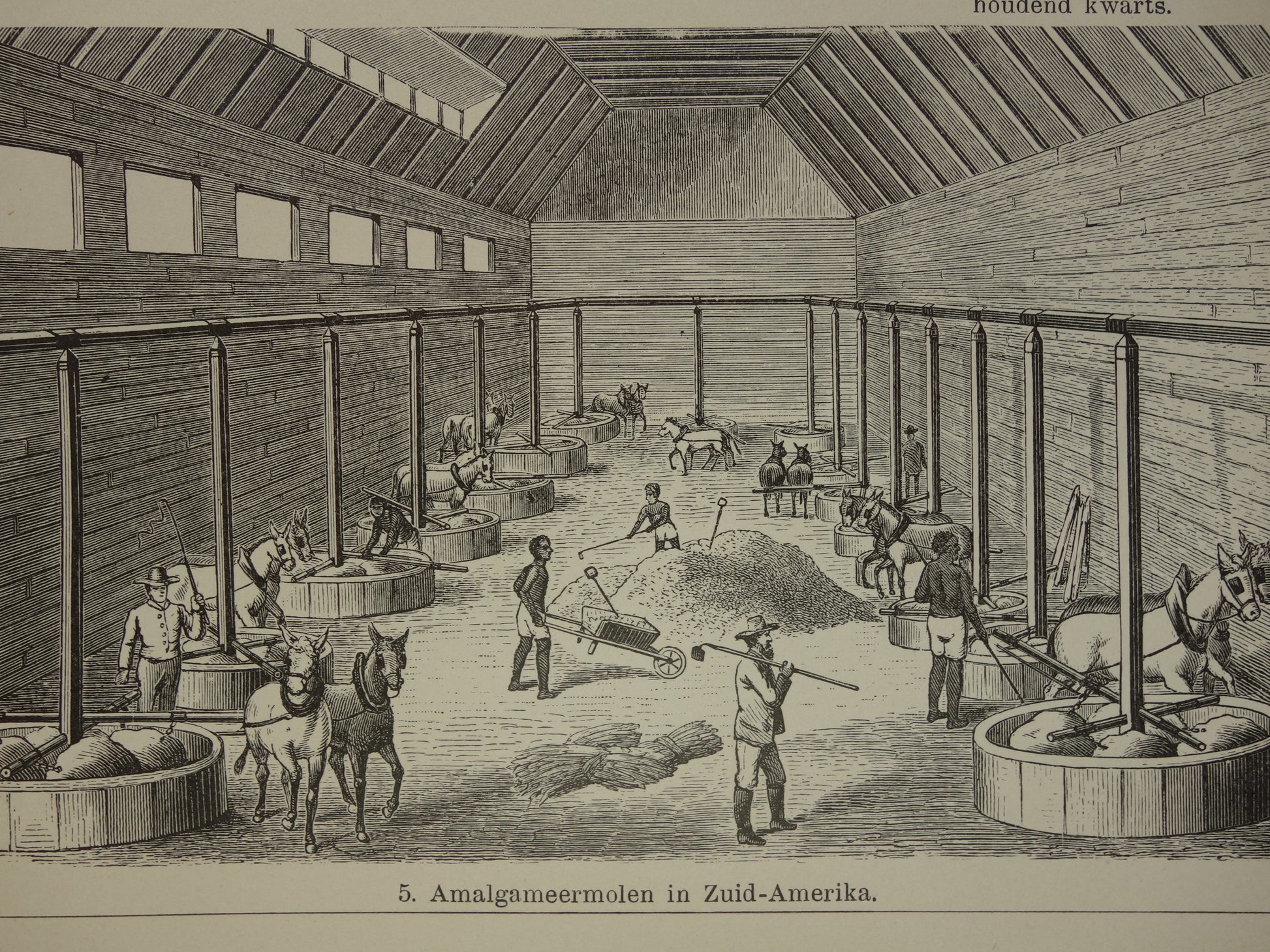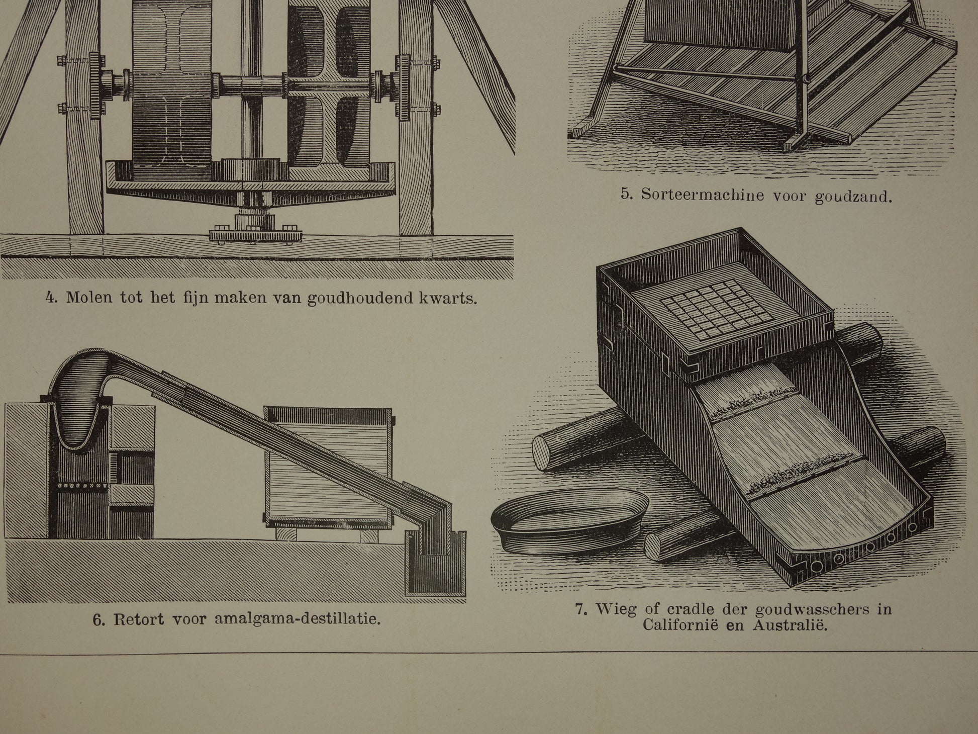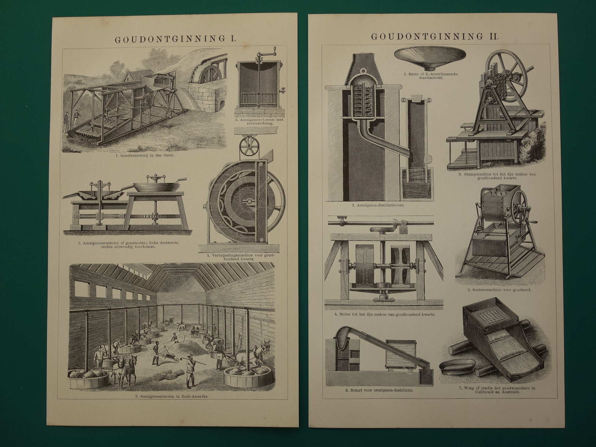 For sale are two Dutch prints about the extraction of gold. Explanatory text is below the images.