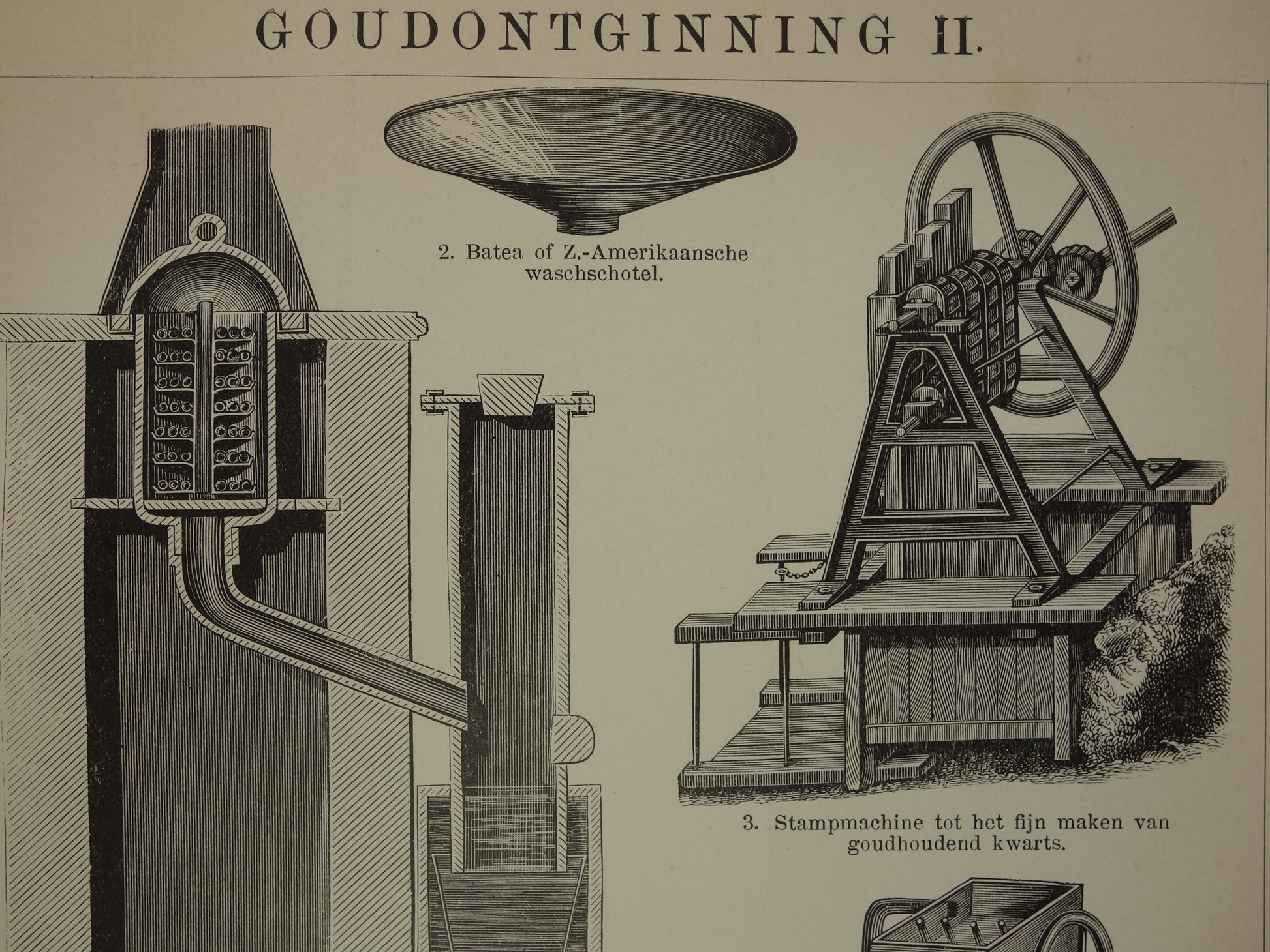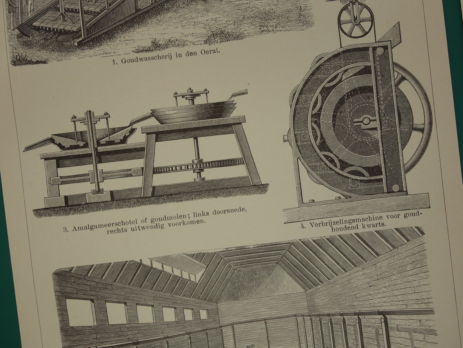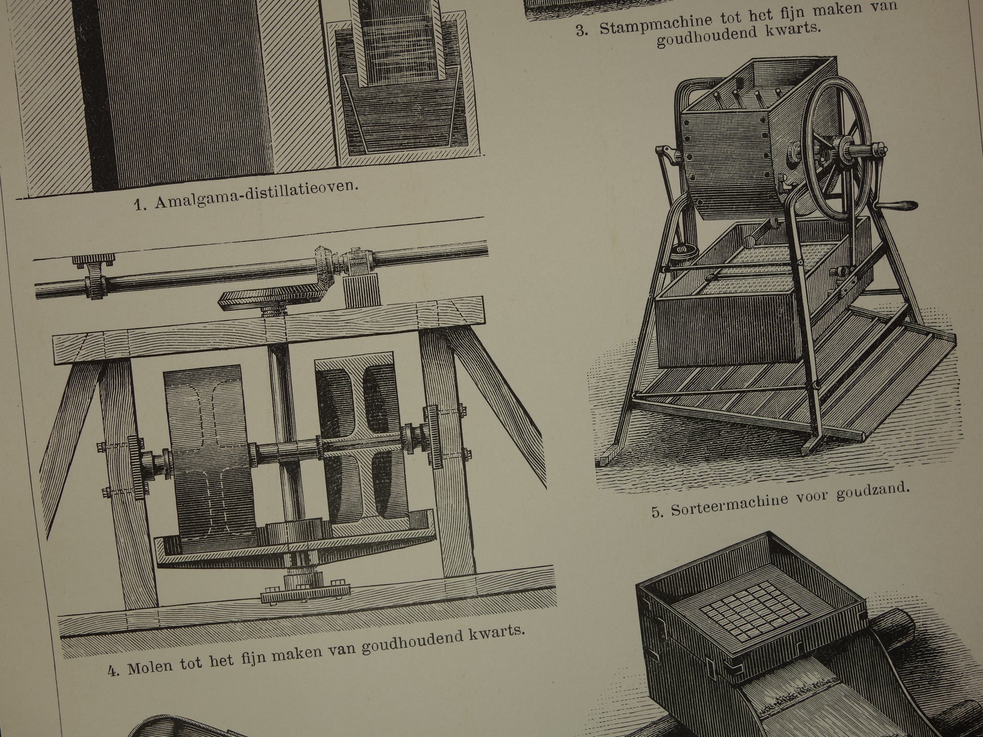 GOLD Set of 2 antique prints about gold mining 1908 original old illustration gold mine exploitation - two vintage Dutch prints