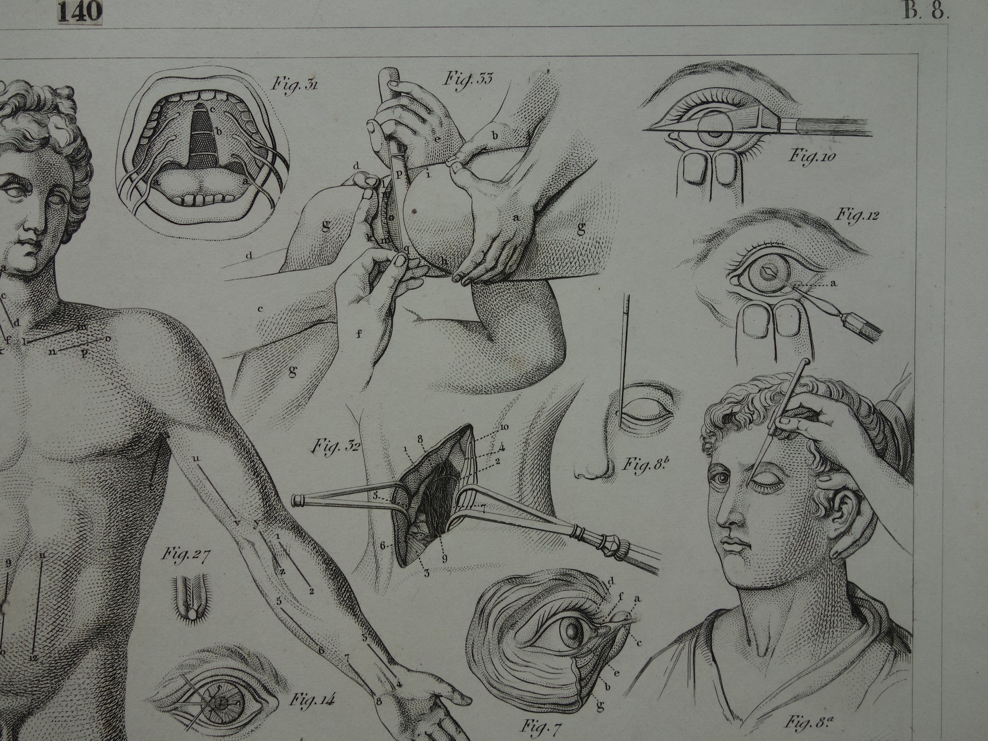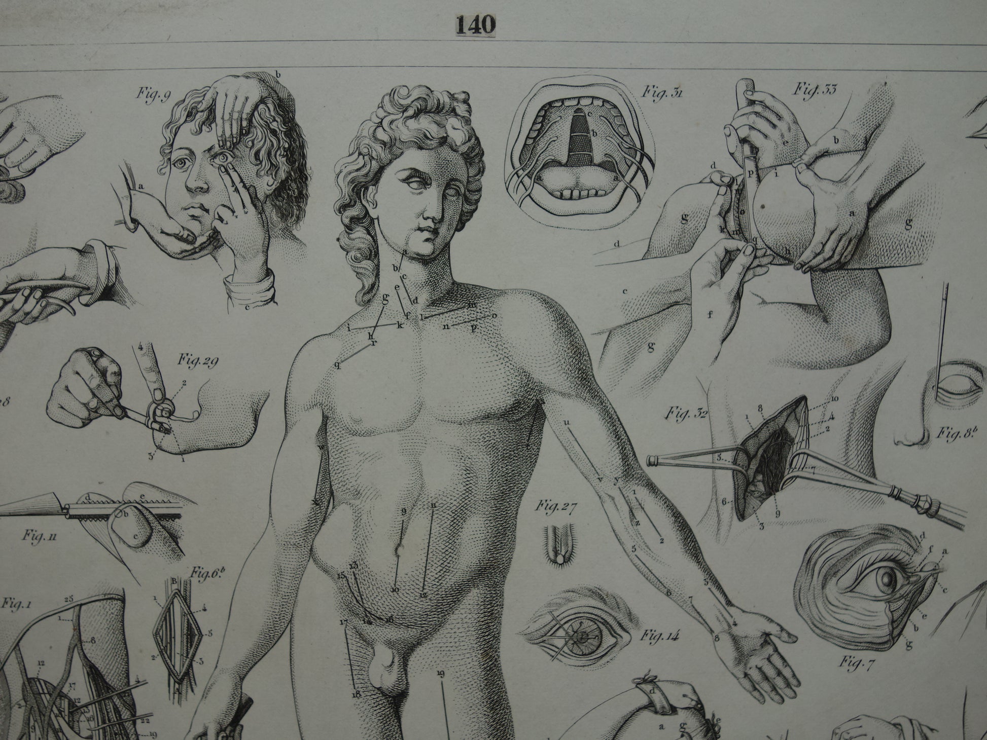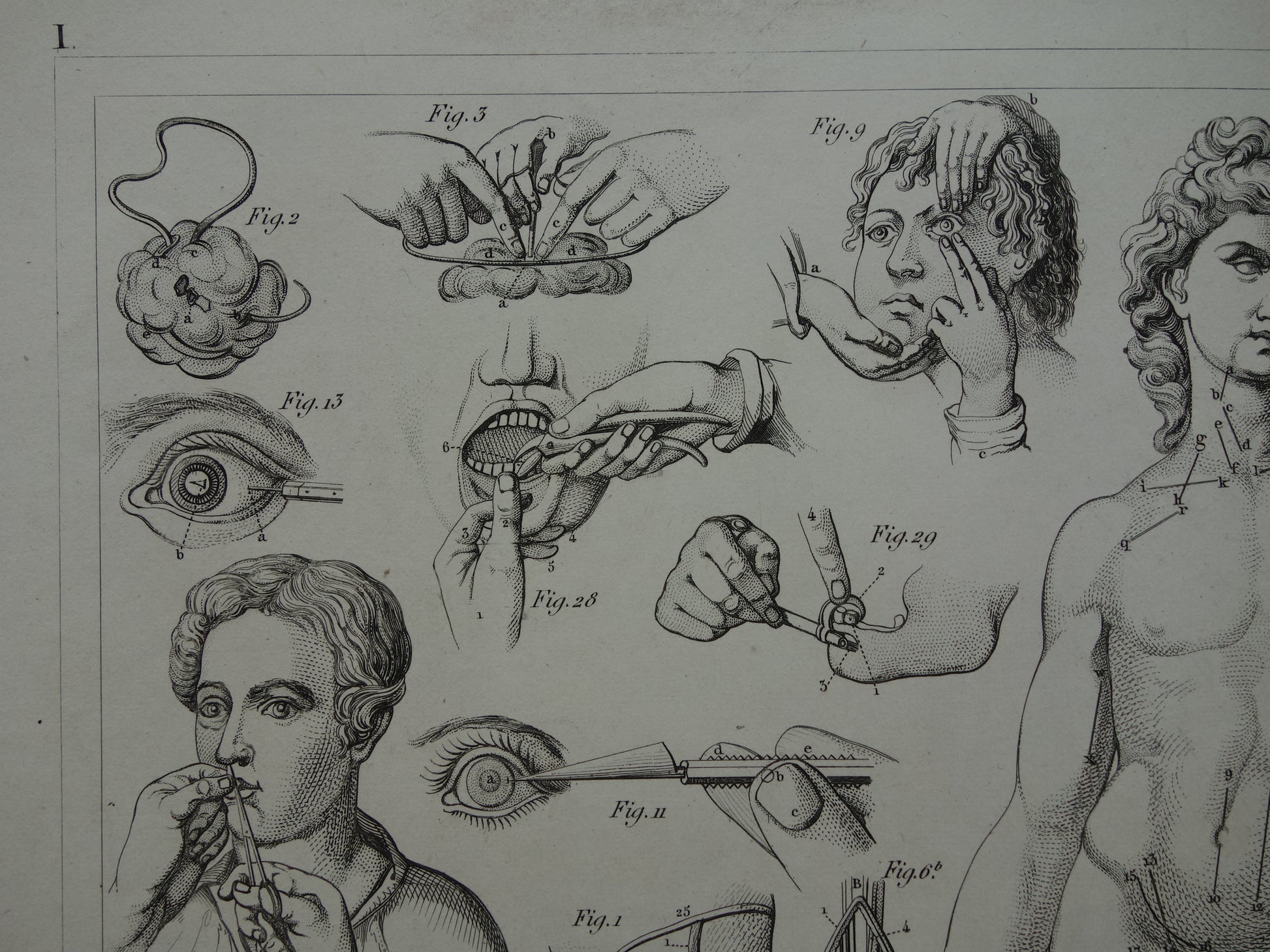 Oude anatomie prent over chirurgie originele antieke print operaties instrumenten chirurg anatomische prenten