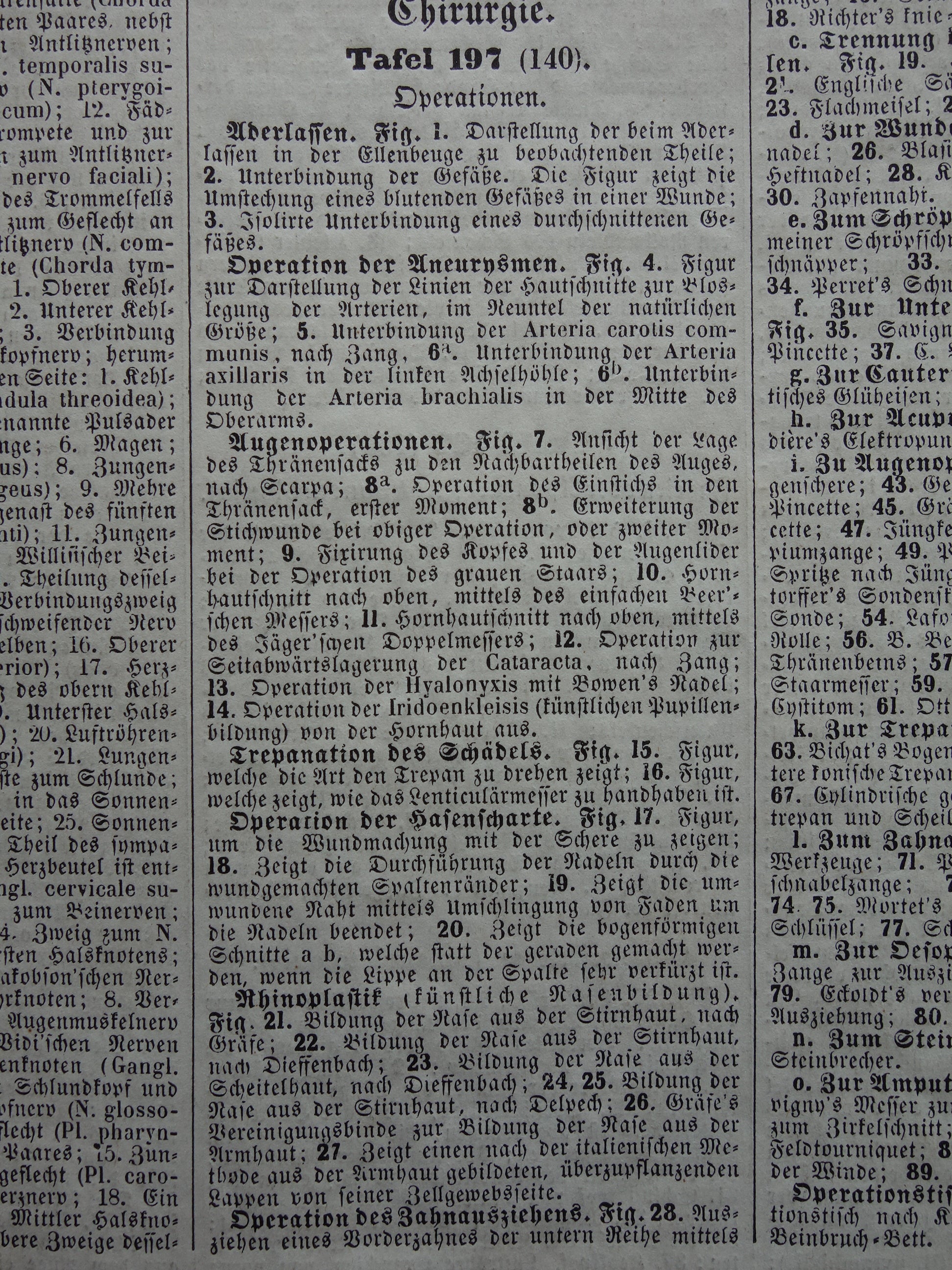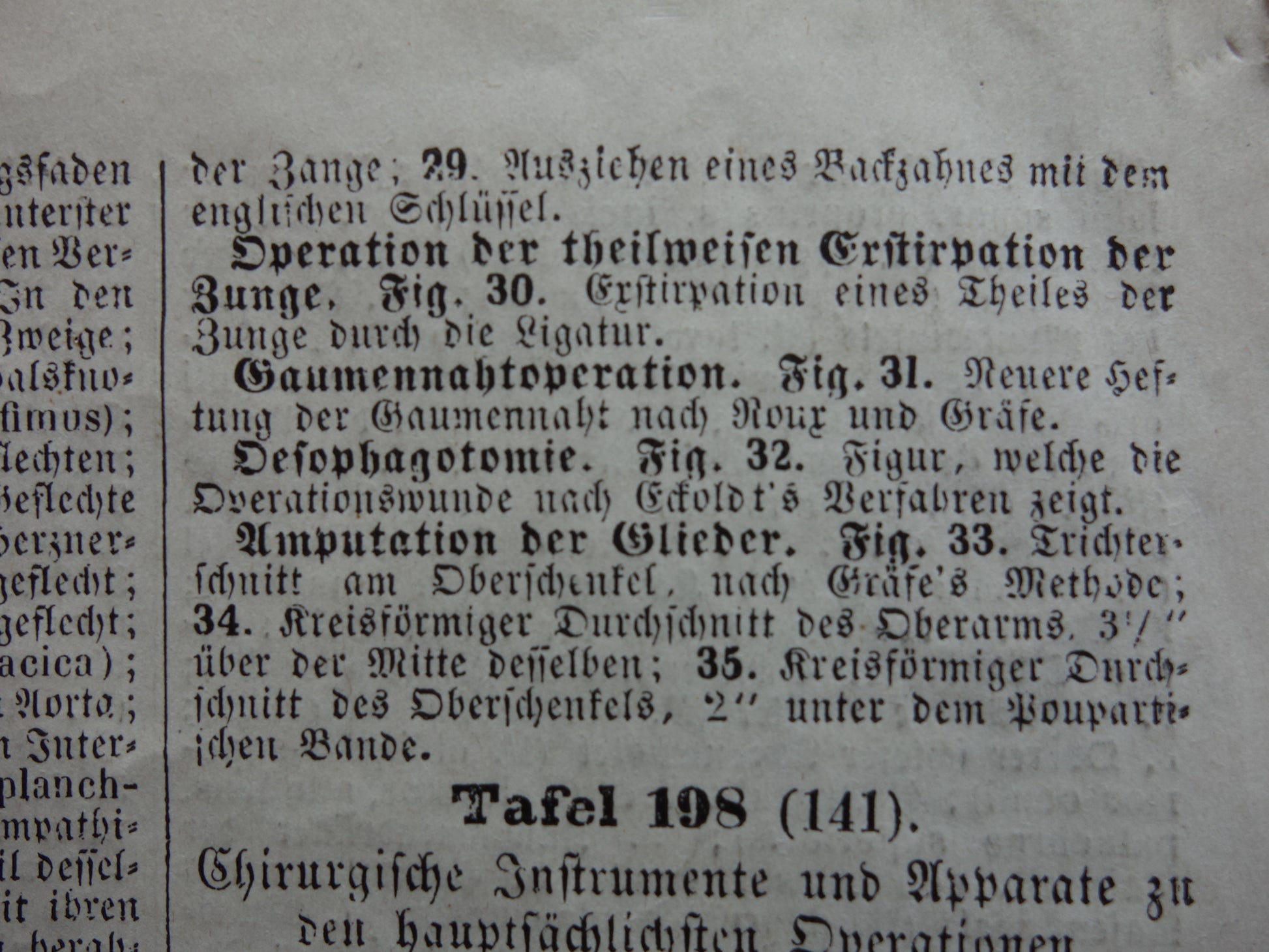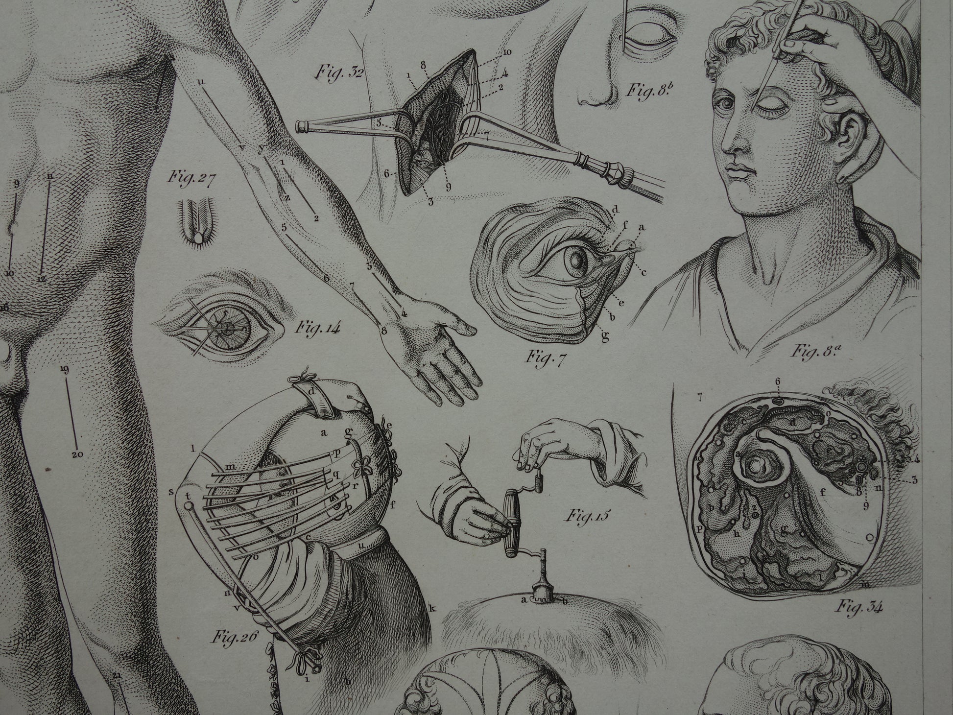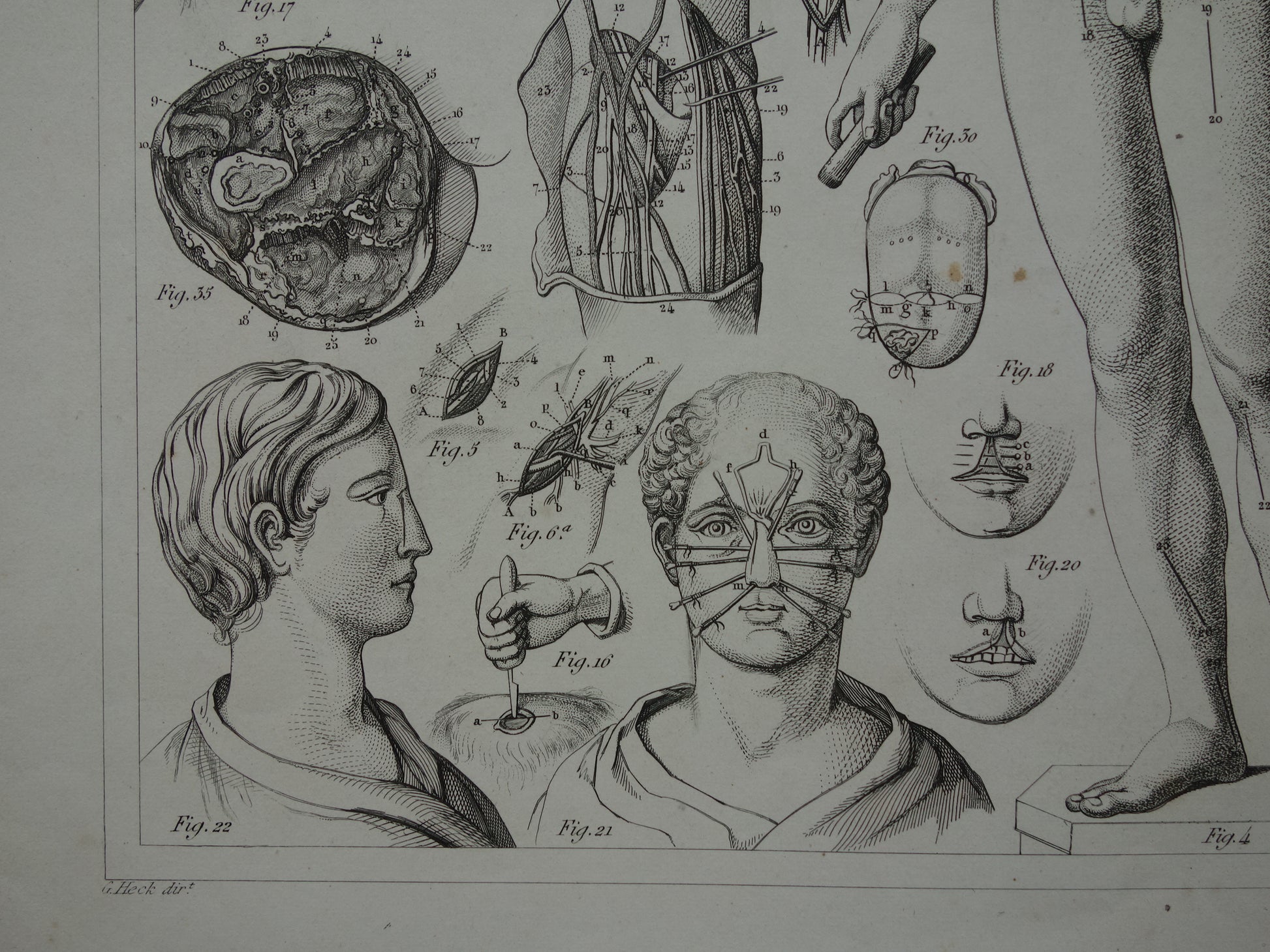 Te koop is een ruim 175 jaar oude anatomie prent met daarop afbeeldingen van chirurgische ingrepen en de instrumenten die daarbij gebruikt worden. Op de laatste twee foto's staat de index van wat precies is afgebeeld (in Duits Frakturschrift).