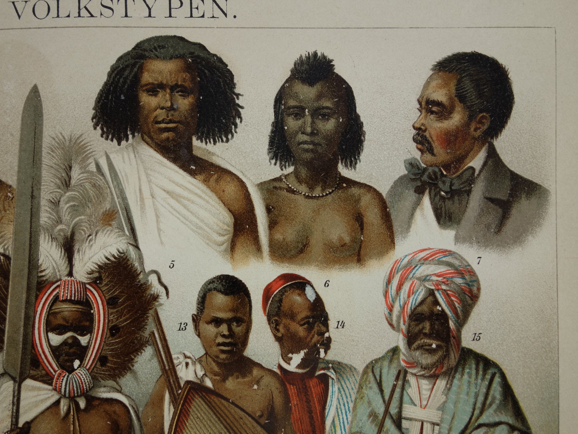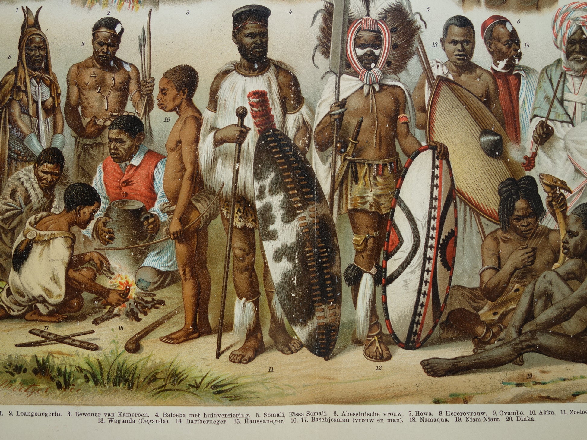 Oude prent Afrikaanse Volken Herero Massai Bosjesman Antieke illustratie stammen Antropologie Etnografie