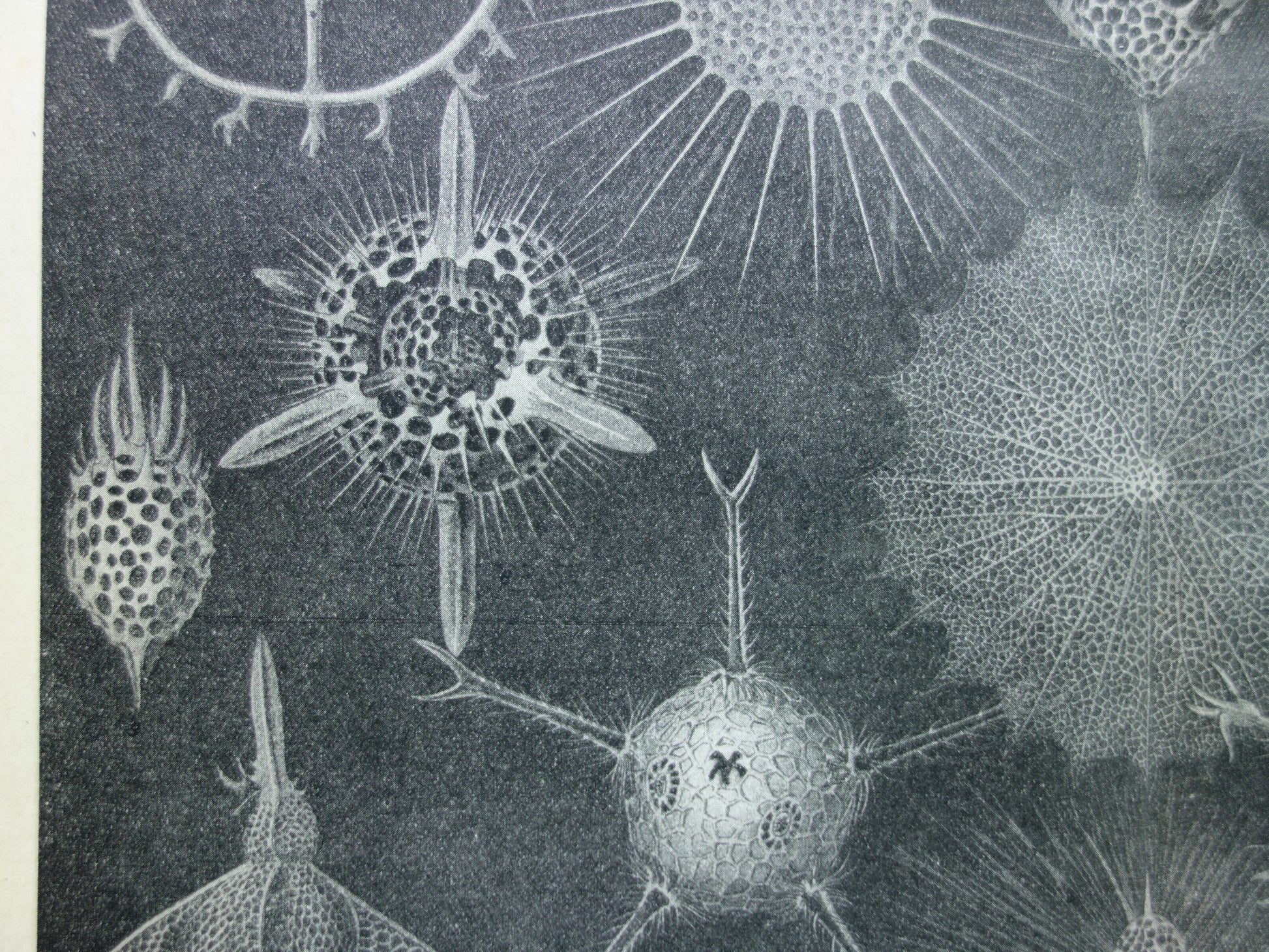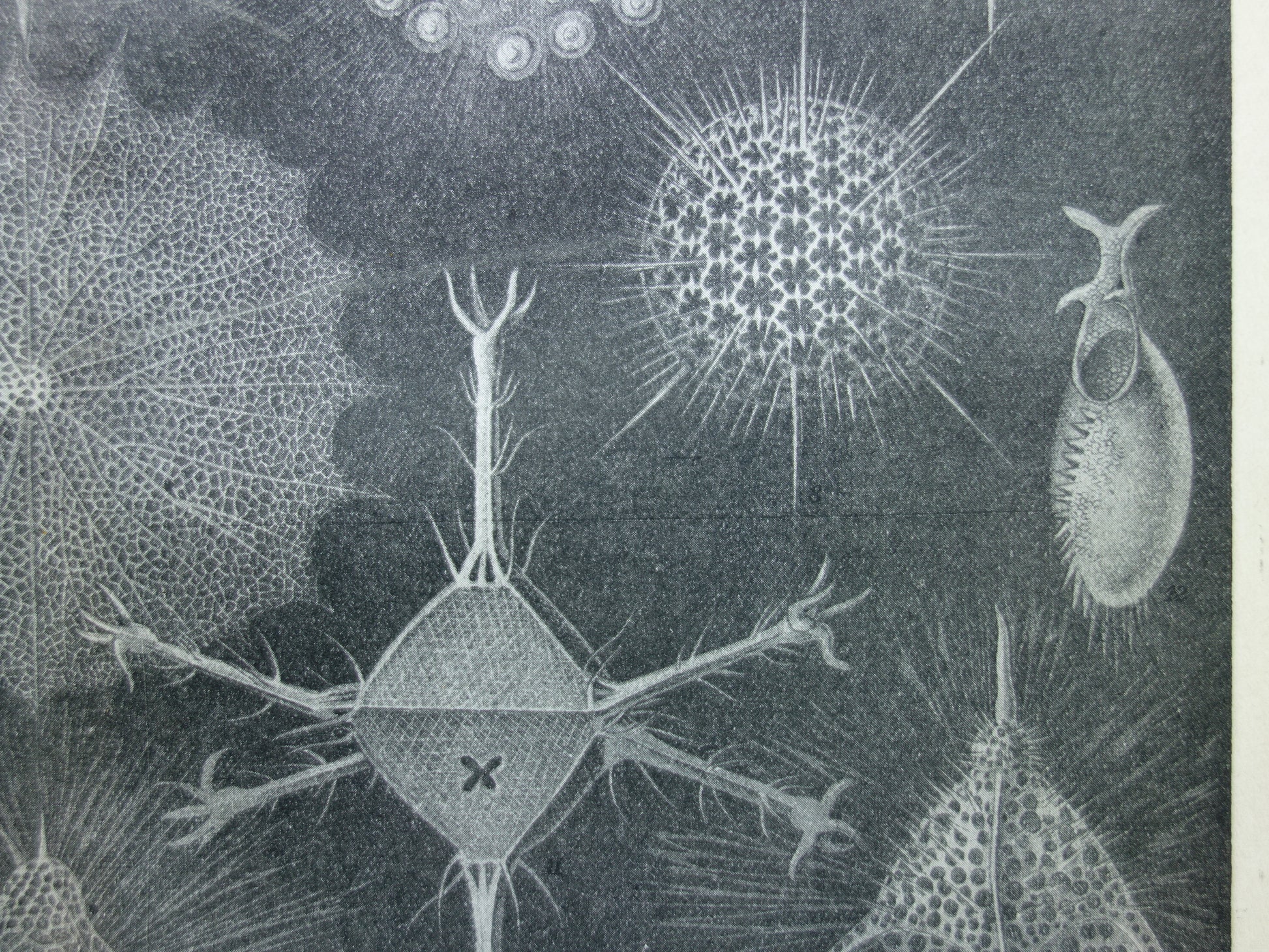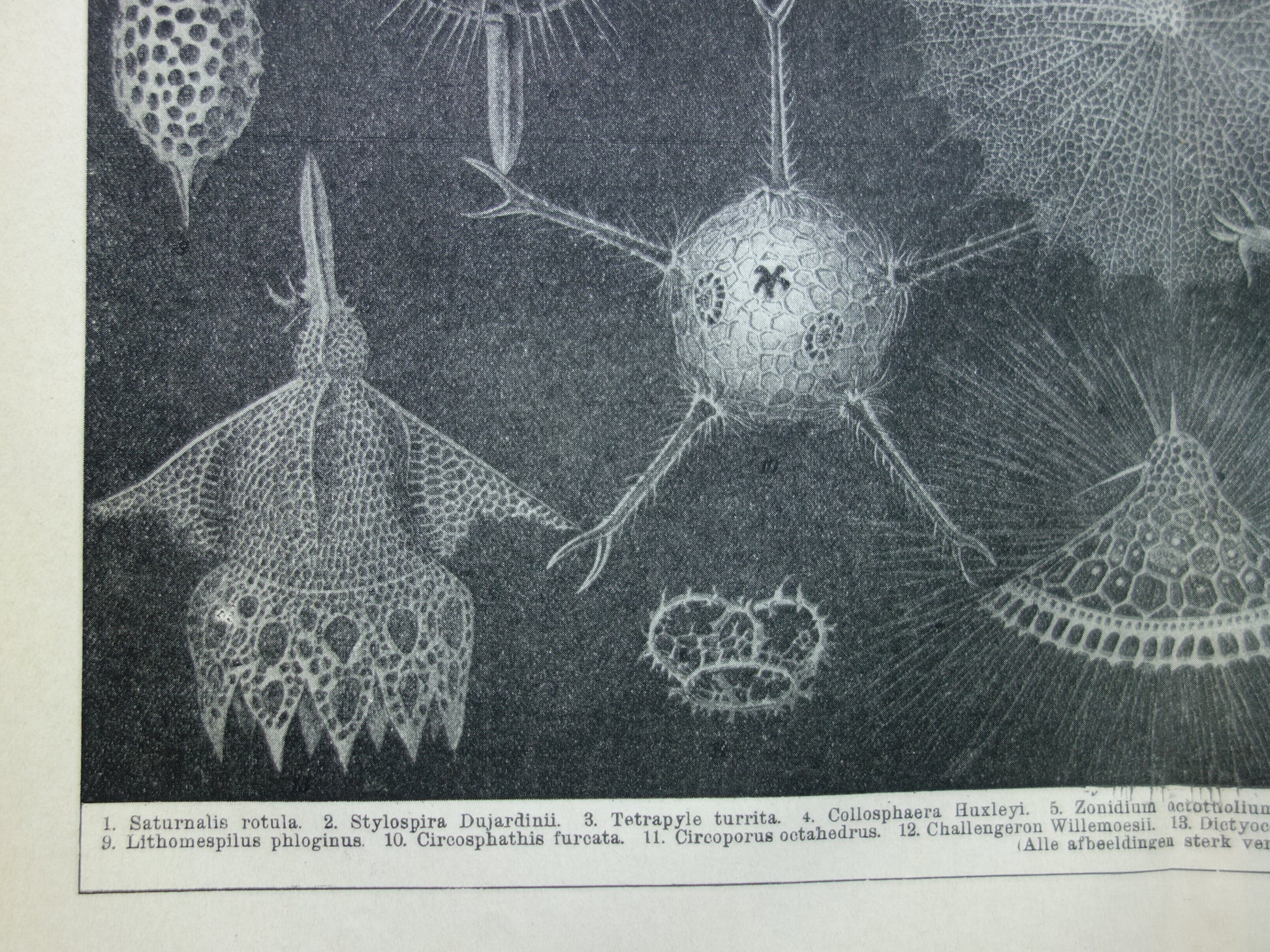 Te koop is een antieke Nederlandse prent met afbeeldingen van stralendiertjes uit het jaar 1922. Afgebeeld staan: 1. Saturnalis rotula, 2. Stylospira Dujardinii, 3. Tartapyle turrita, 4. Collosphaera Huxleyi, 5. Zonidium octotholium, 6. Actinomma Asteracanthion, 7. Cladarachnium ramosum, 8. Heliosphaera elegans, 9. Lithomespilus phloginus, 10. Circosphathis frucata, 11. Circoporus octahedrus, 12. Challengeron Willemoesii, 13. Dictyocodon annasethe, 14. Acanthodesmia corona, 15. Eucecryphalus Gegenbauri, 16. Dictyopodium trilobum.