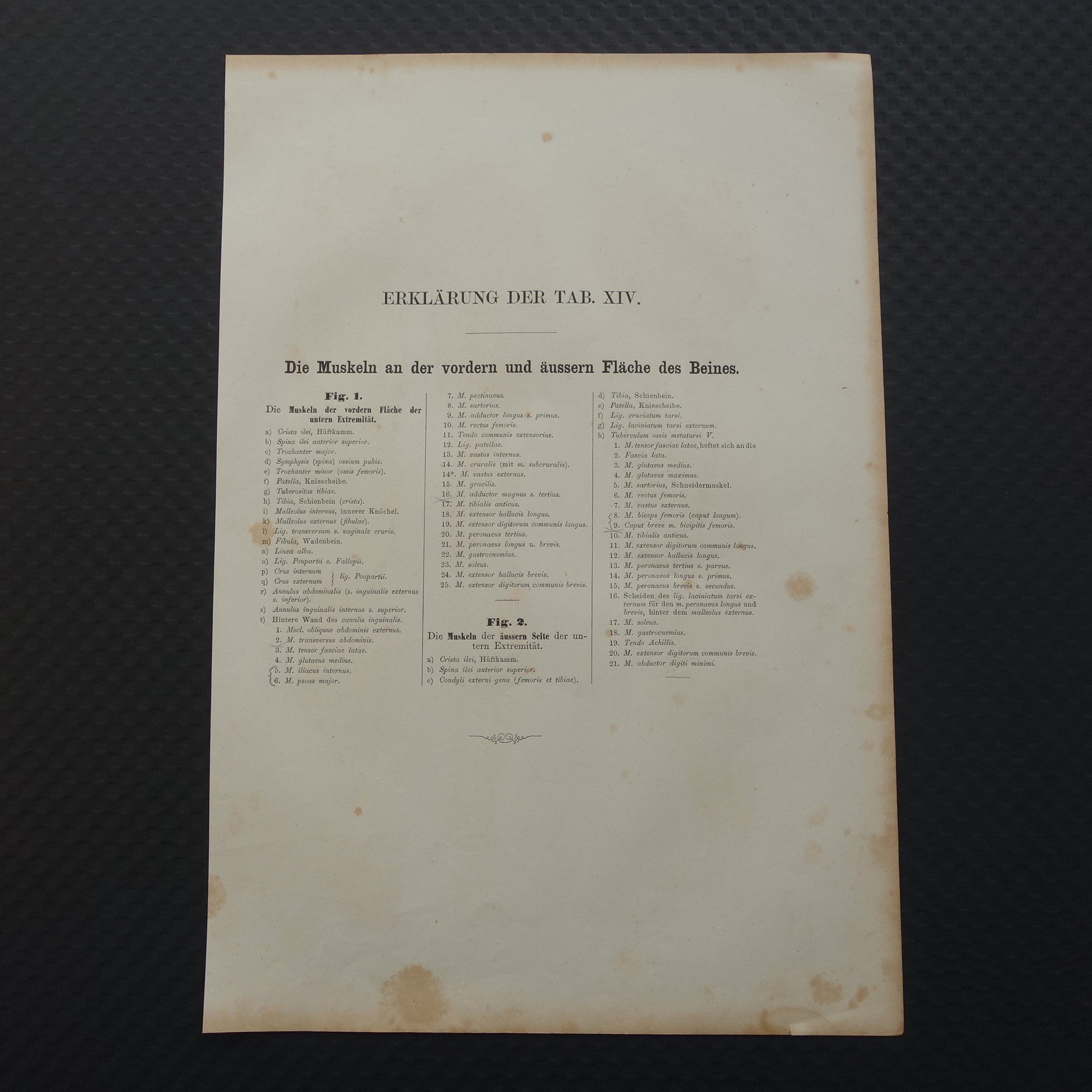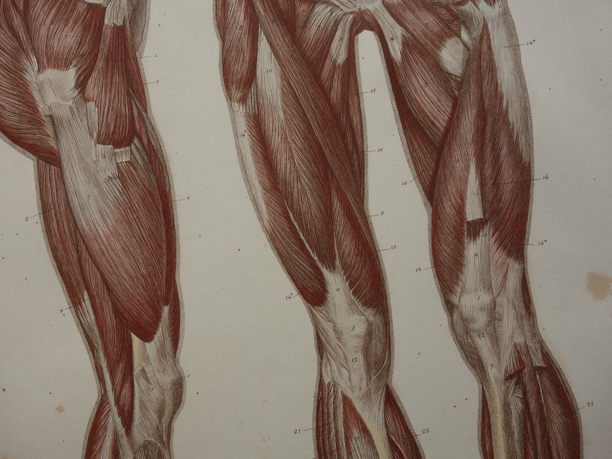 Fraaie antieke kopergravure van de beenspieren (gezien van voren en opzij). De afbeeldingen zijn gedetailleerd, zoom de foto's om dat goed te kunnen zien.