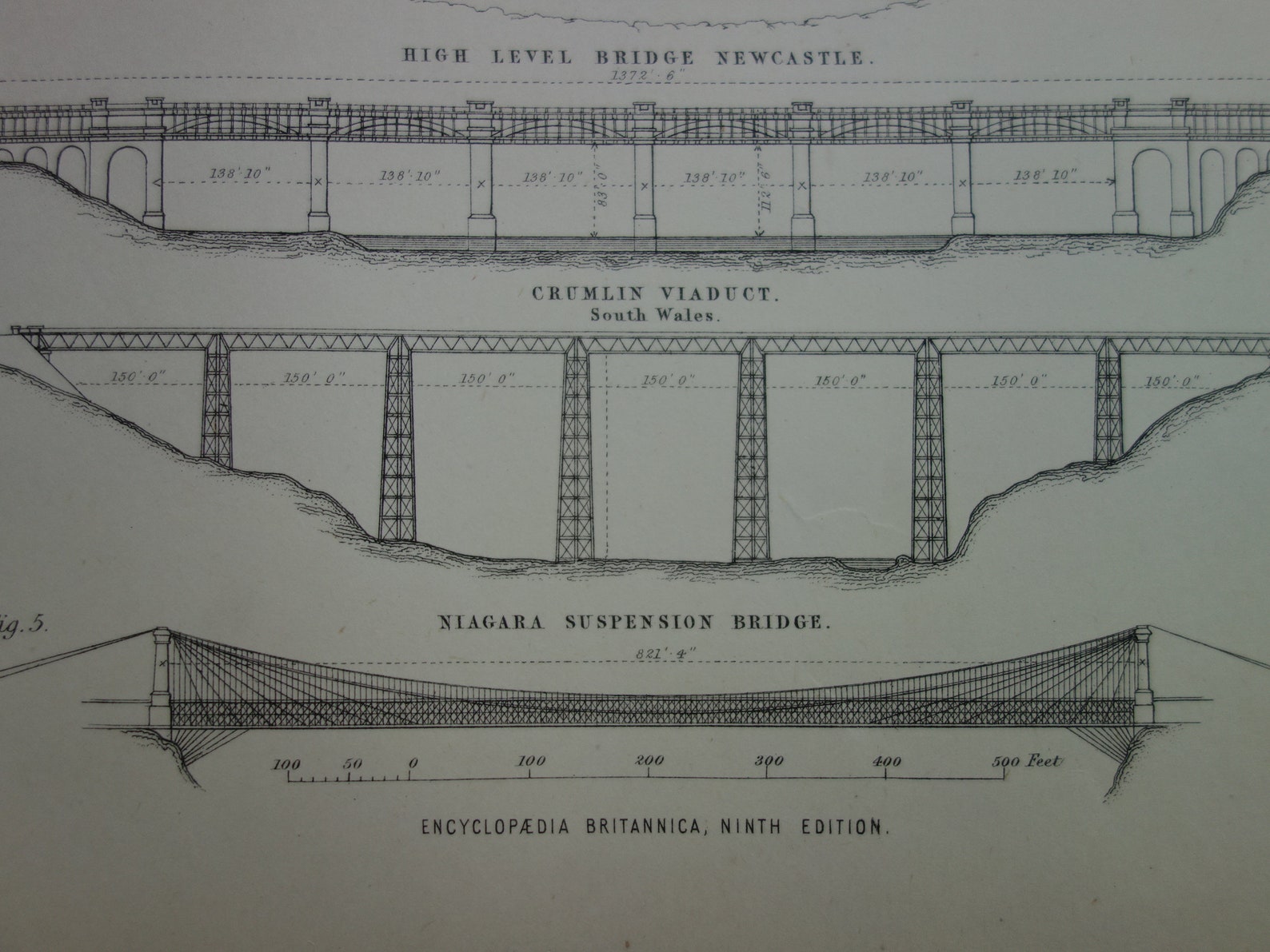 Te koop is een mooie oude Engelse prent over bruggenbouw. Zoom de foto's om te zien welke beroemde bruggen staan afgebeeld. Heel geschikt om in te lijsten.