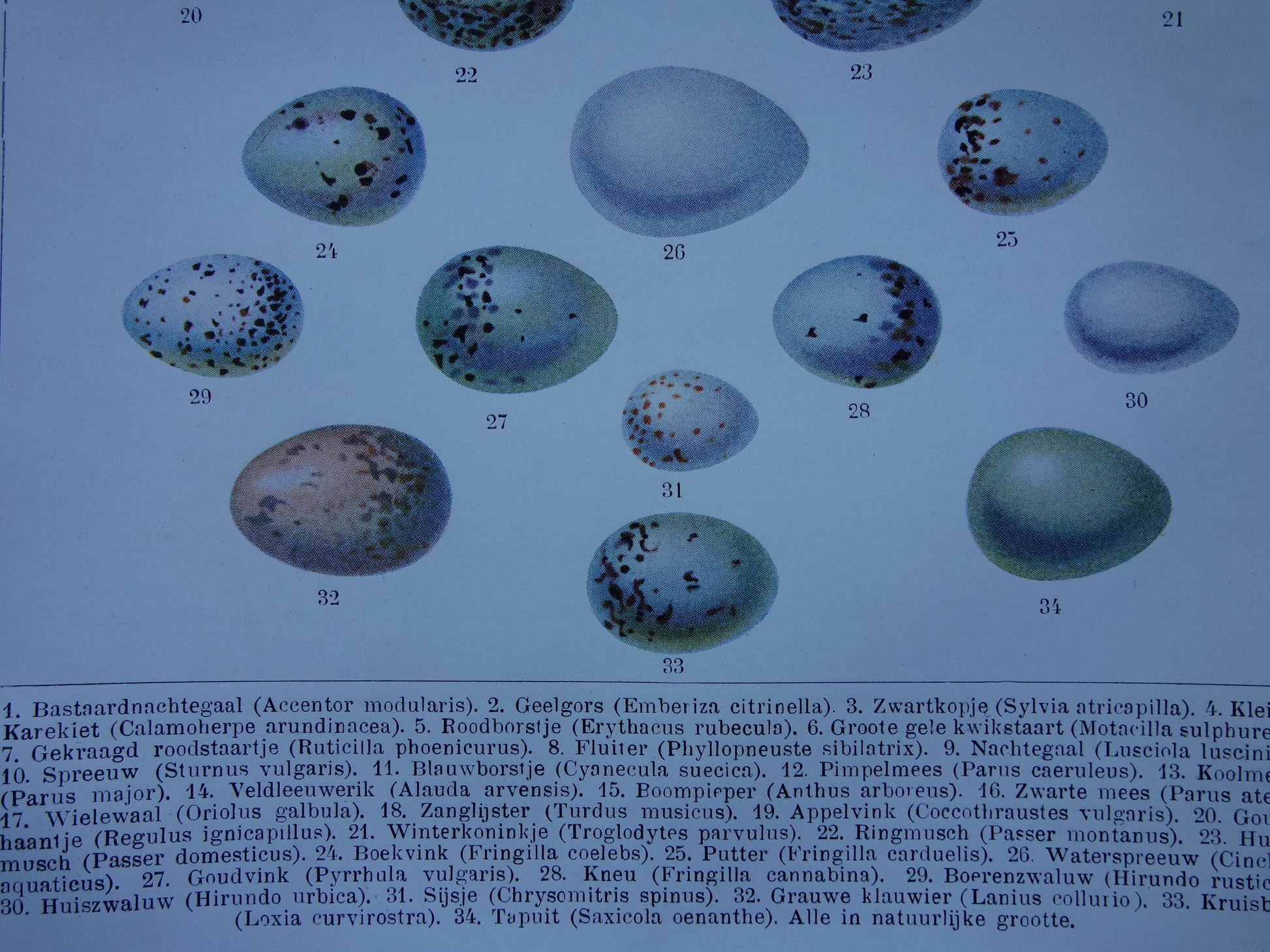 Te koop is oude Nederlandse prent met daarop afbeeldingen van verschillende eieren van zangvogels.