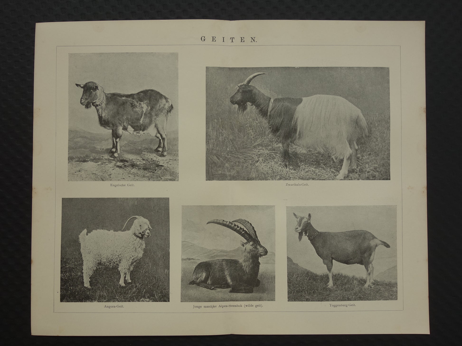 Te koop is een antieke Nederlandse prent met afbeeldingen van geiten uit het jaar 1907. Deze prent komt uit een encyclopedie en aan het begin van de 20e eeuw kwamen de eerste encyclopediëen met foto's. De foto's zien er, zoals u kunt zien, nog vrij knullig uit.