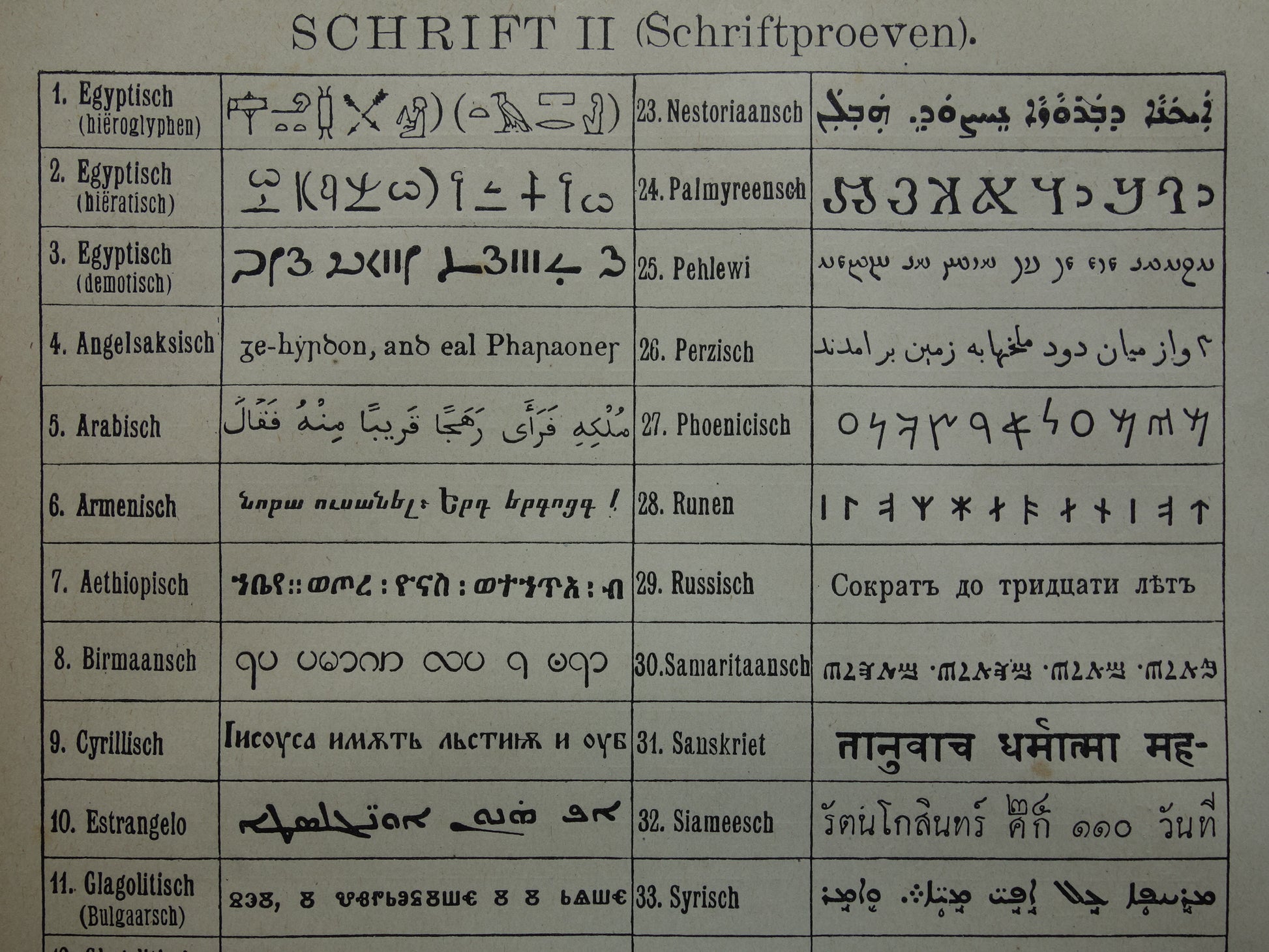 Leuke antieke Nederlandse prent over de geschiedenis van het alfabet. De prent is dubbelzijdig.