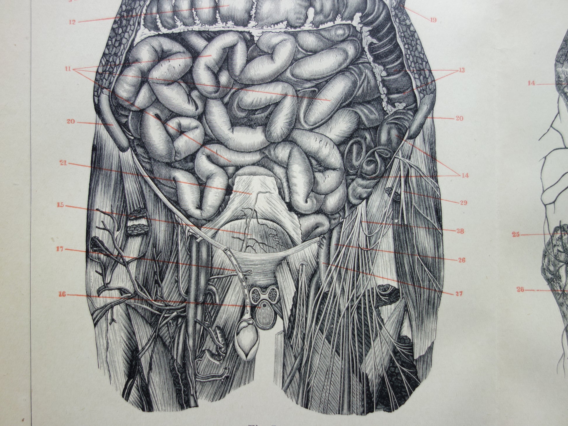 Te koop is een ruim 100 jaar oude Nederlandse anatomische prent van de 'buikingewanden van den mensch'.