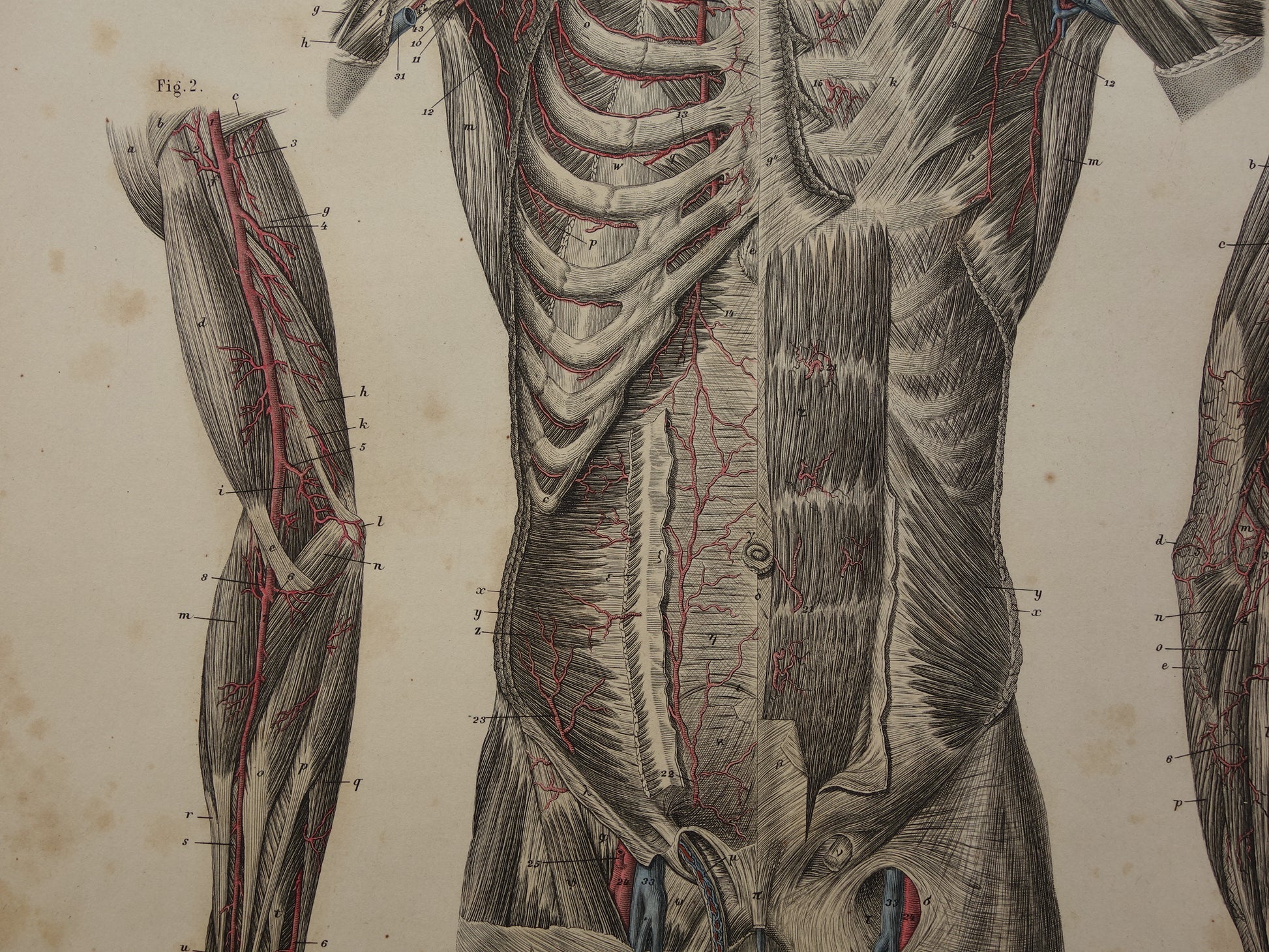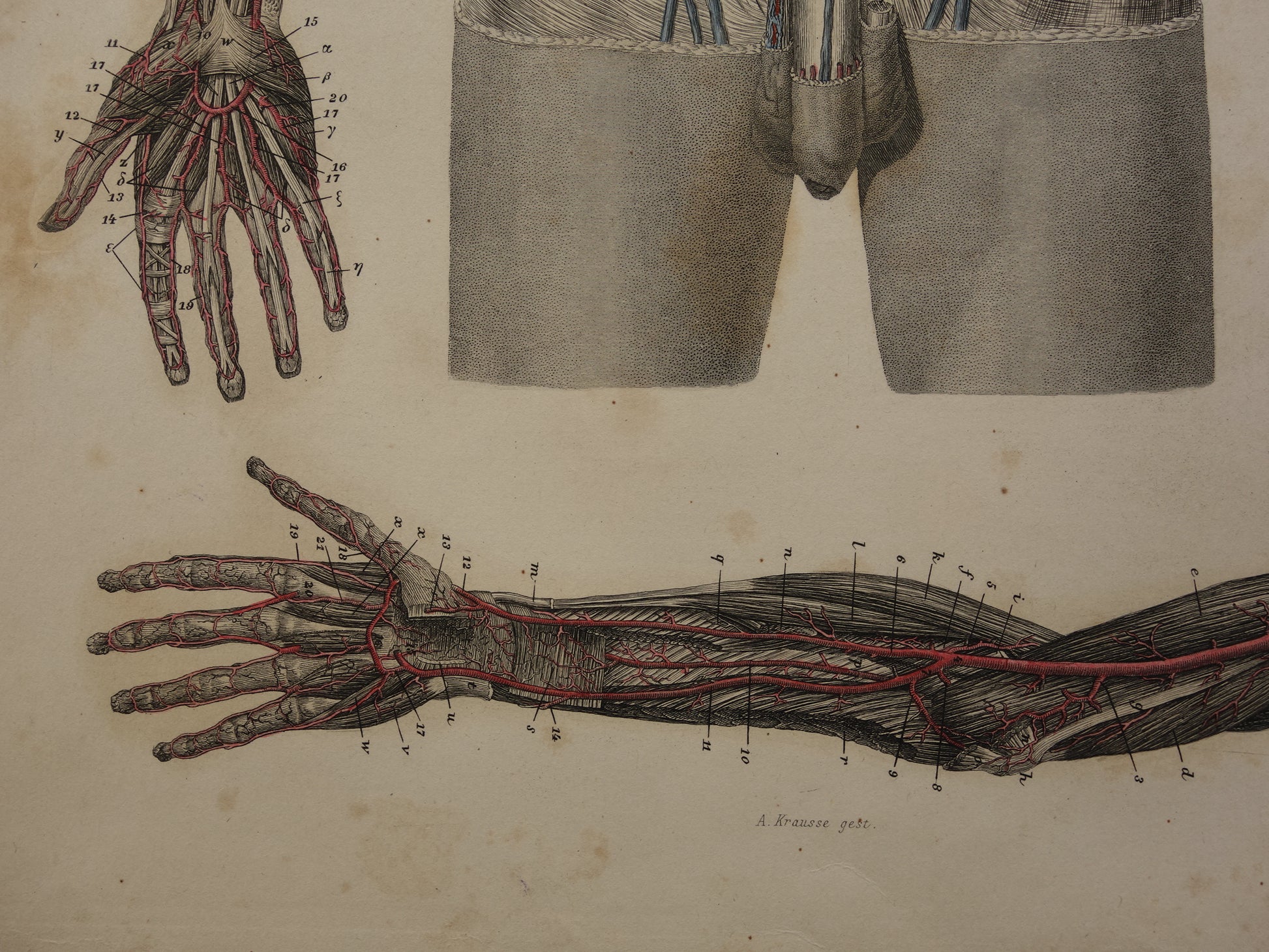 Fraaie antieke kopergravure van de slagaders in de armen en romp. De afbeeldingen zijn gedetailleerd, zoom de foto's om dat goed te kunnen zien.