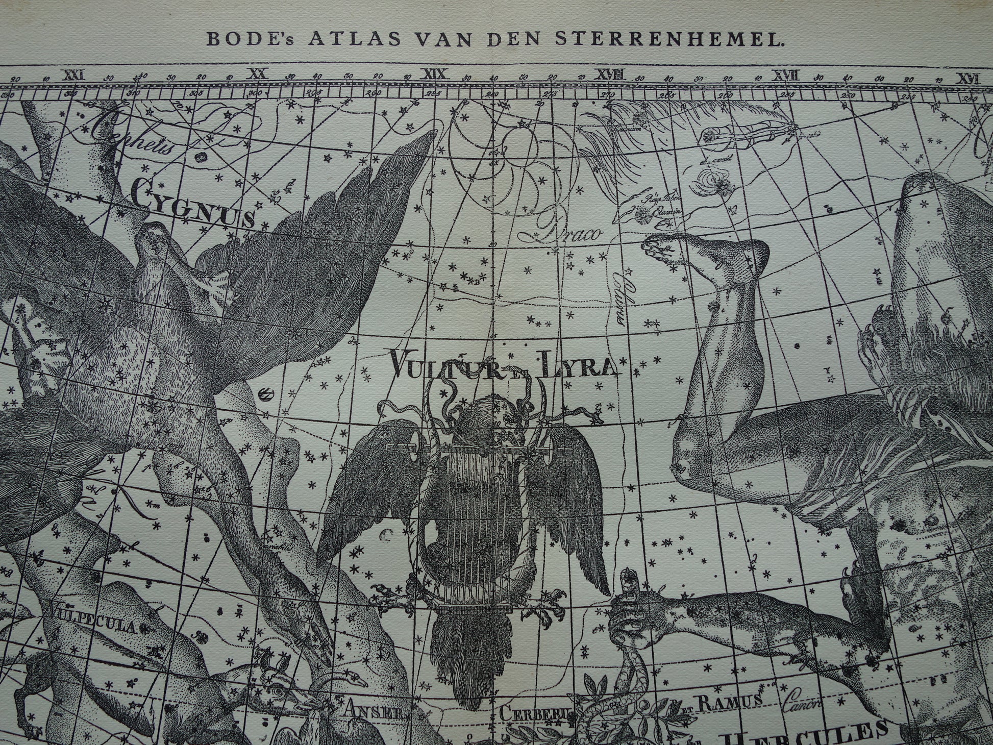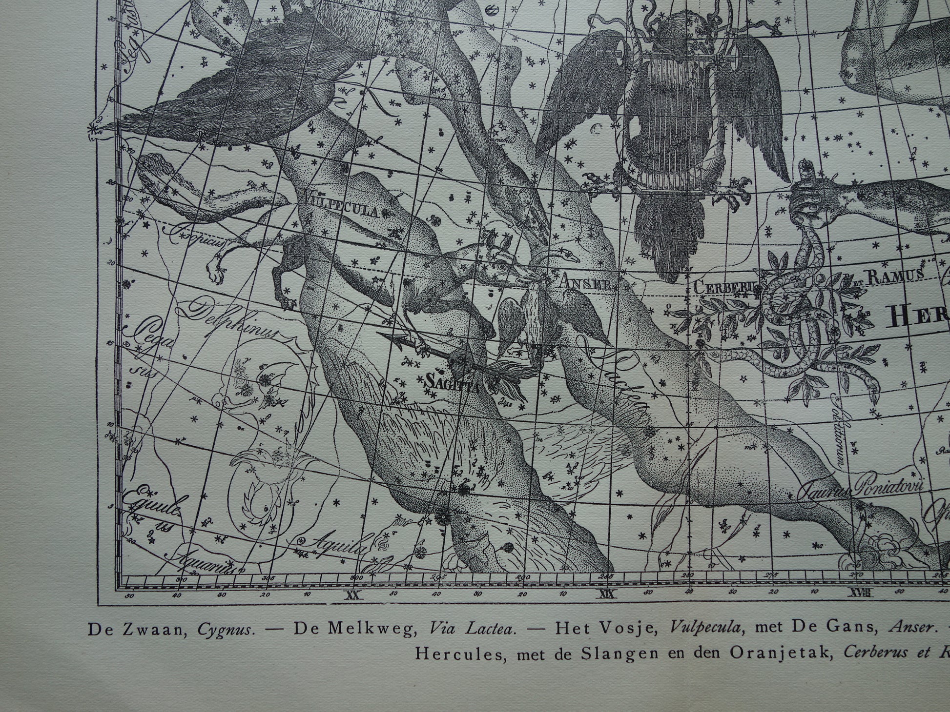 Te koop is een mooie Nederlandse sterrenkaart met de sterrenbeelden Hercules, Cygnus (=Zwaan) en Vultur Lyra (= Gier met een Lier).