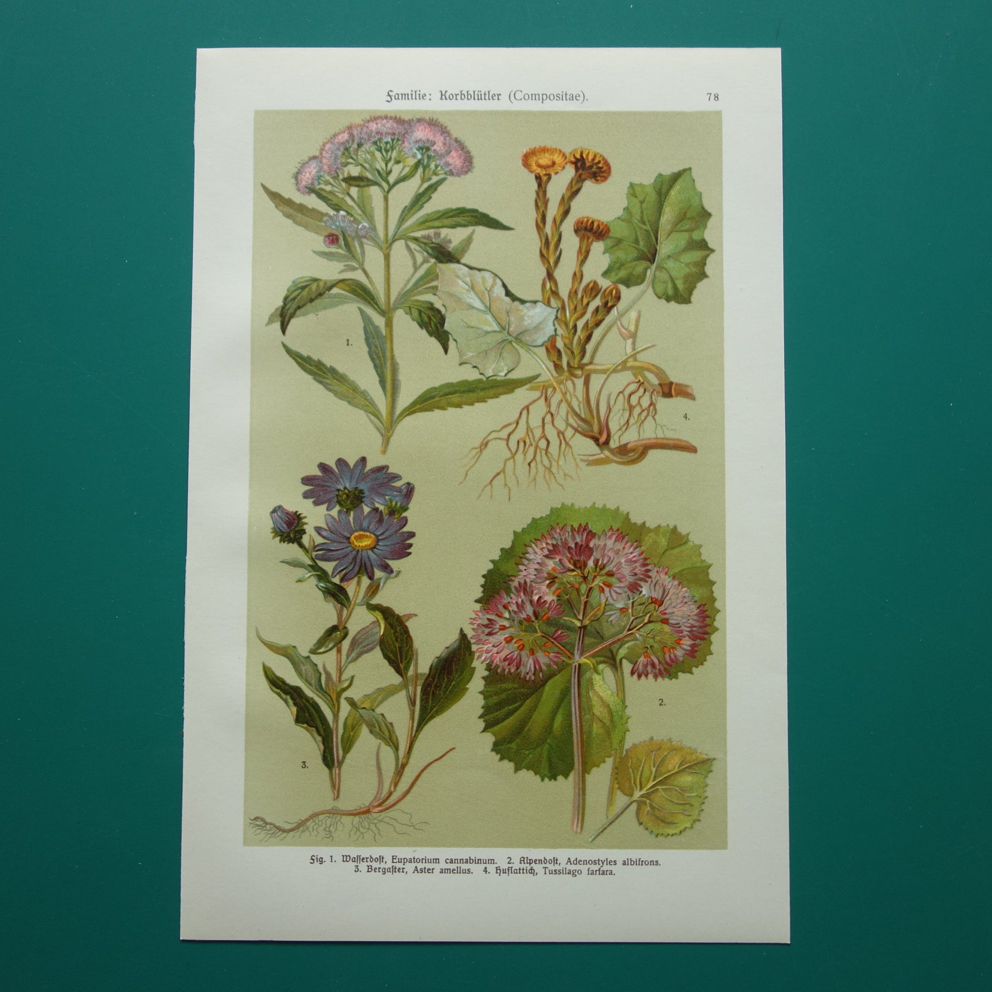 Te koop is een oude Duitse botanische prent met afbeeldingen van de volgende bloemen / plantensoorten: