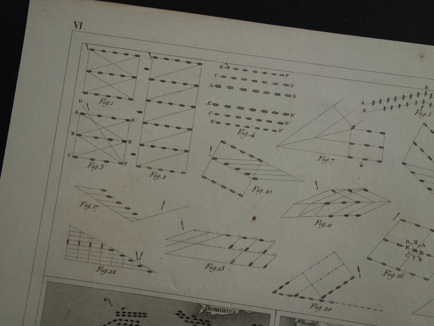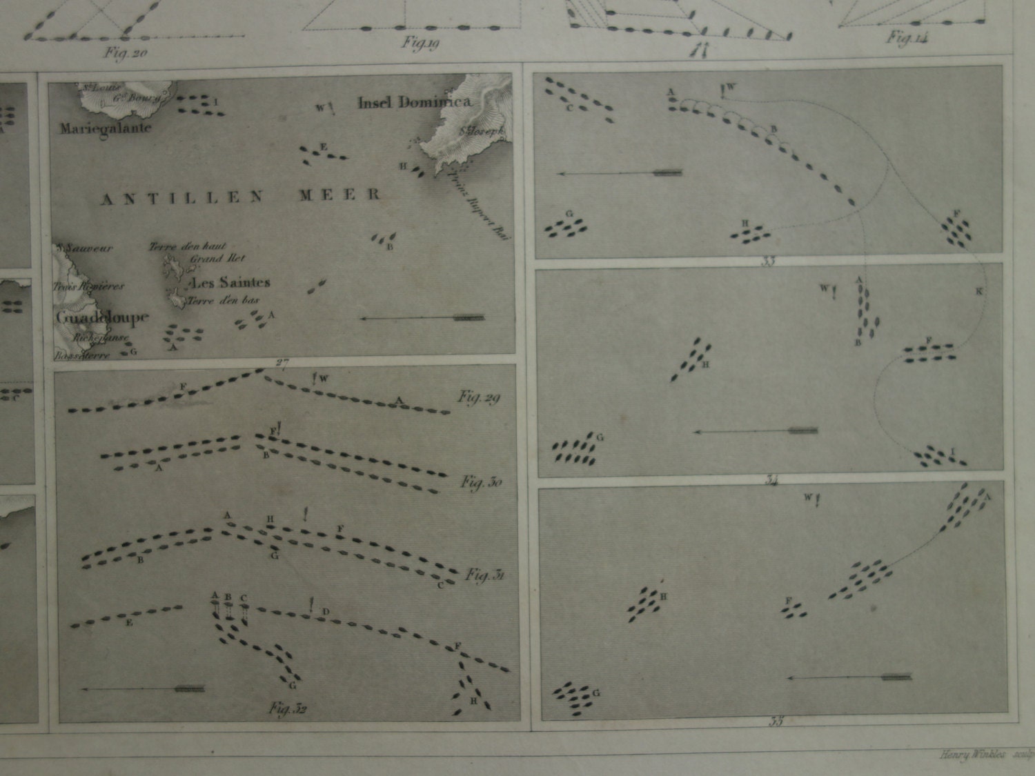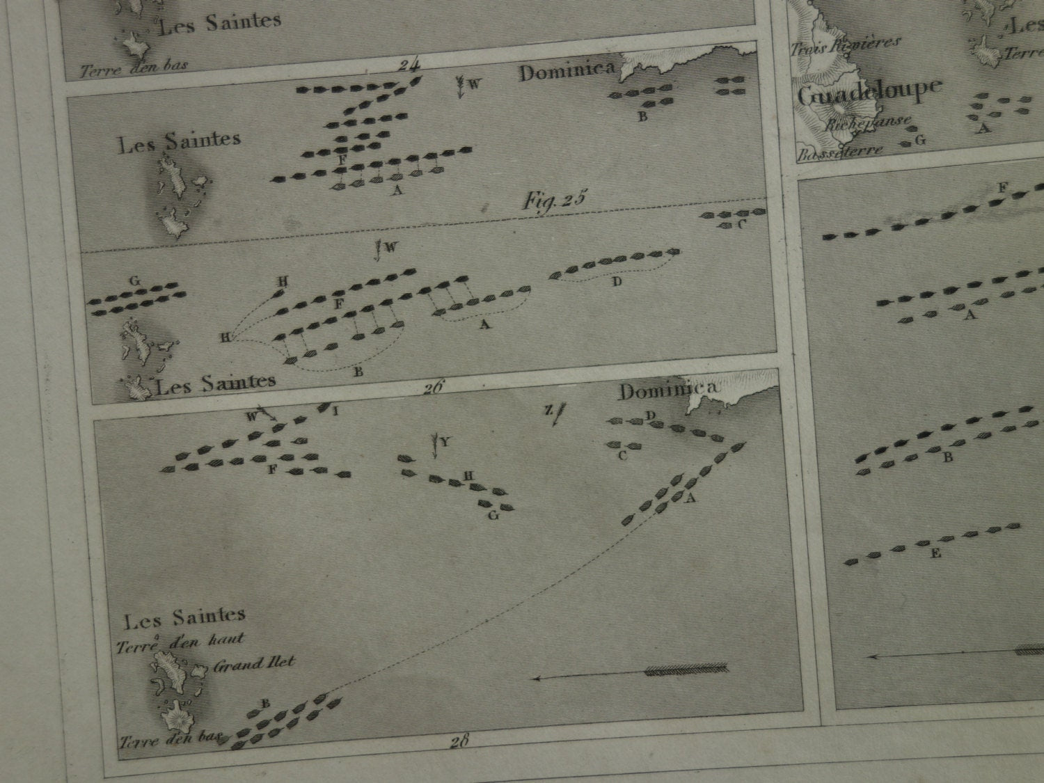 Te koop is een interessante antieke prent over tactieken in zeeslagen. De bovenkant van de prent toont manoeuvres. De onderste helft toont de Slag bij de Saintes eilanden (of de Slag bij Dominica), waarbij de Britse vloot de Franse vloot versloeg. Rodney werd hierdoor bekend voor de tactiek van het "doorbreken van de linie" in de slag.