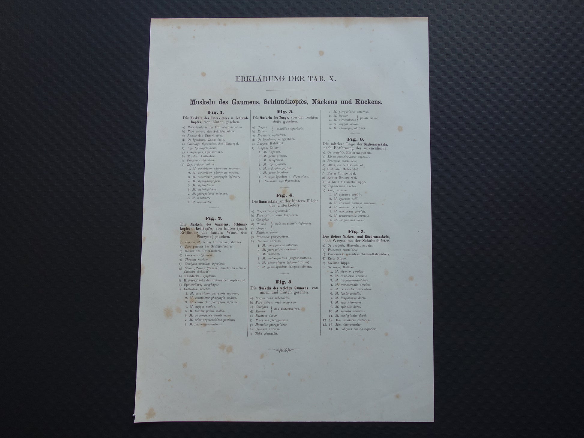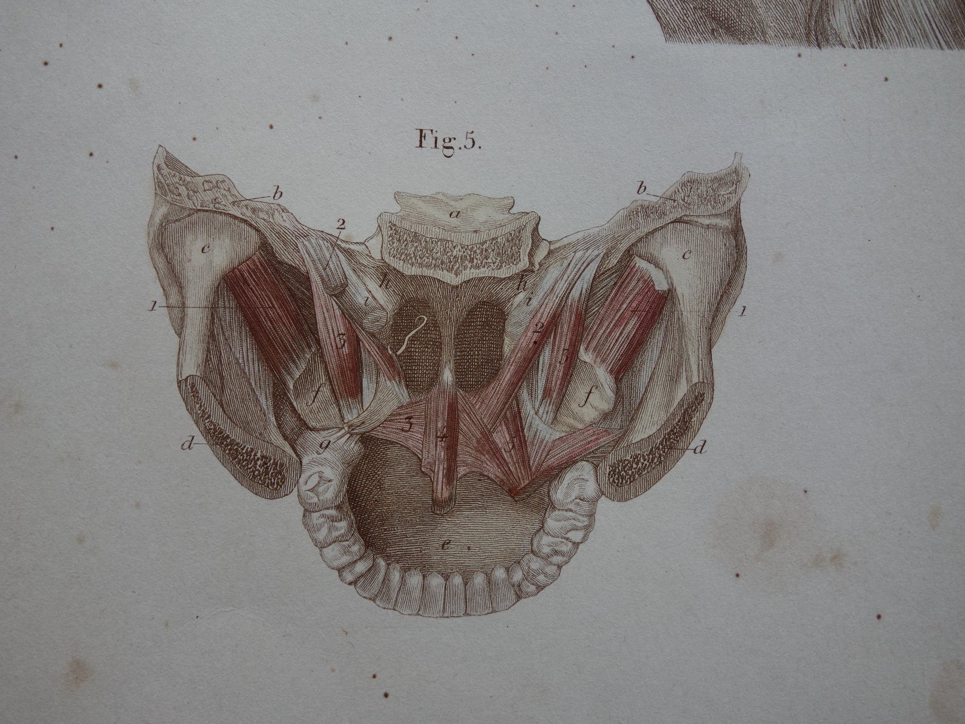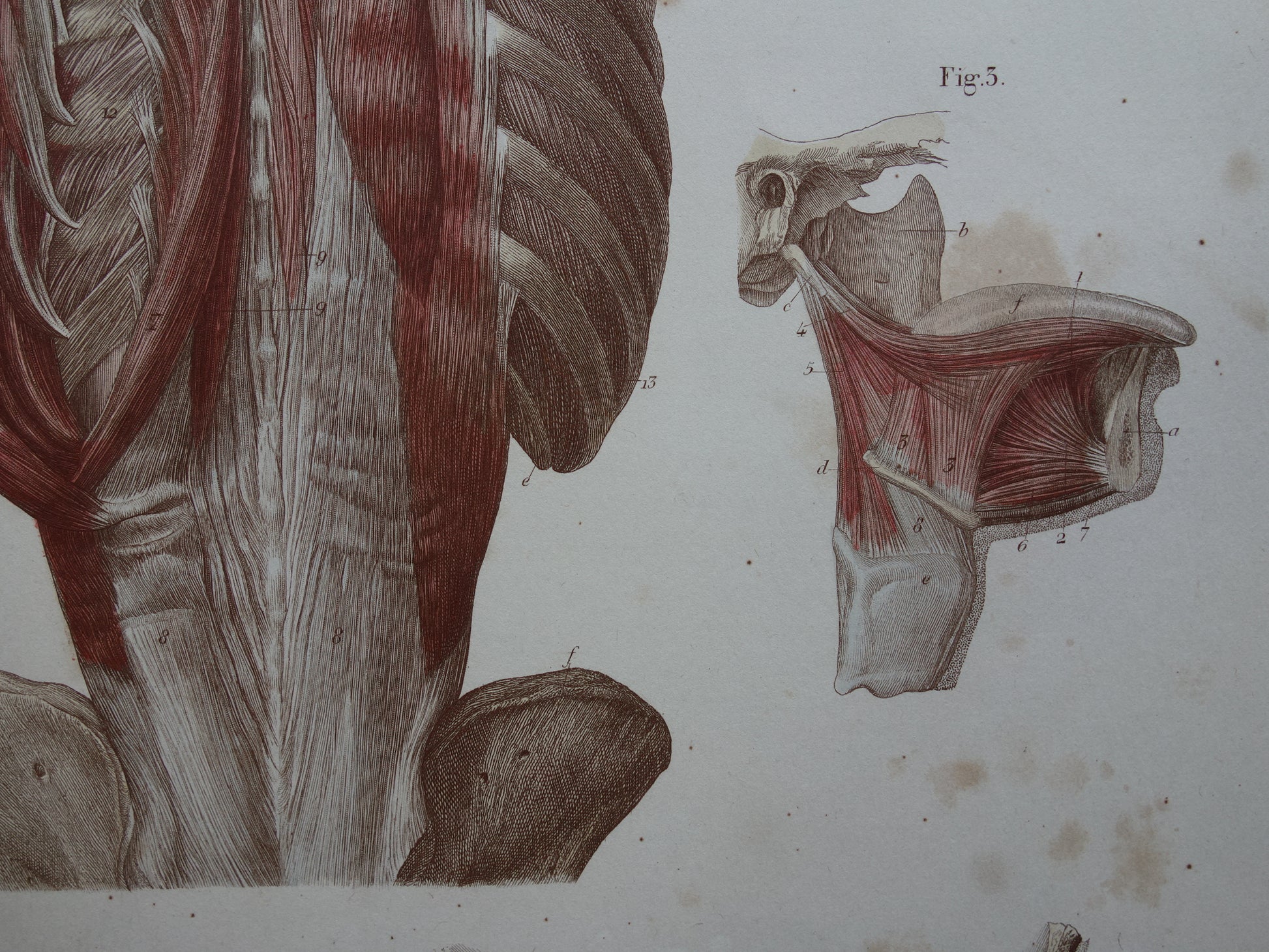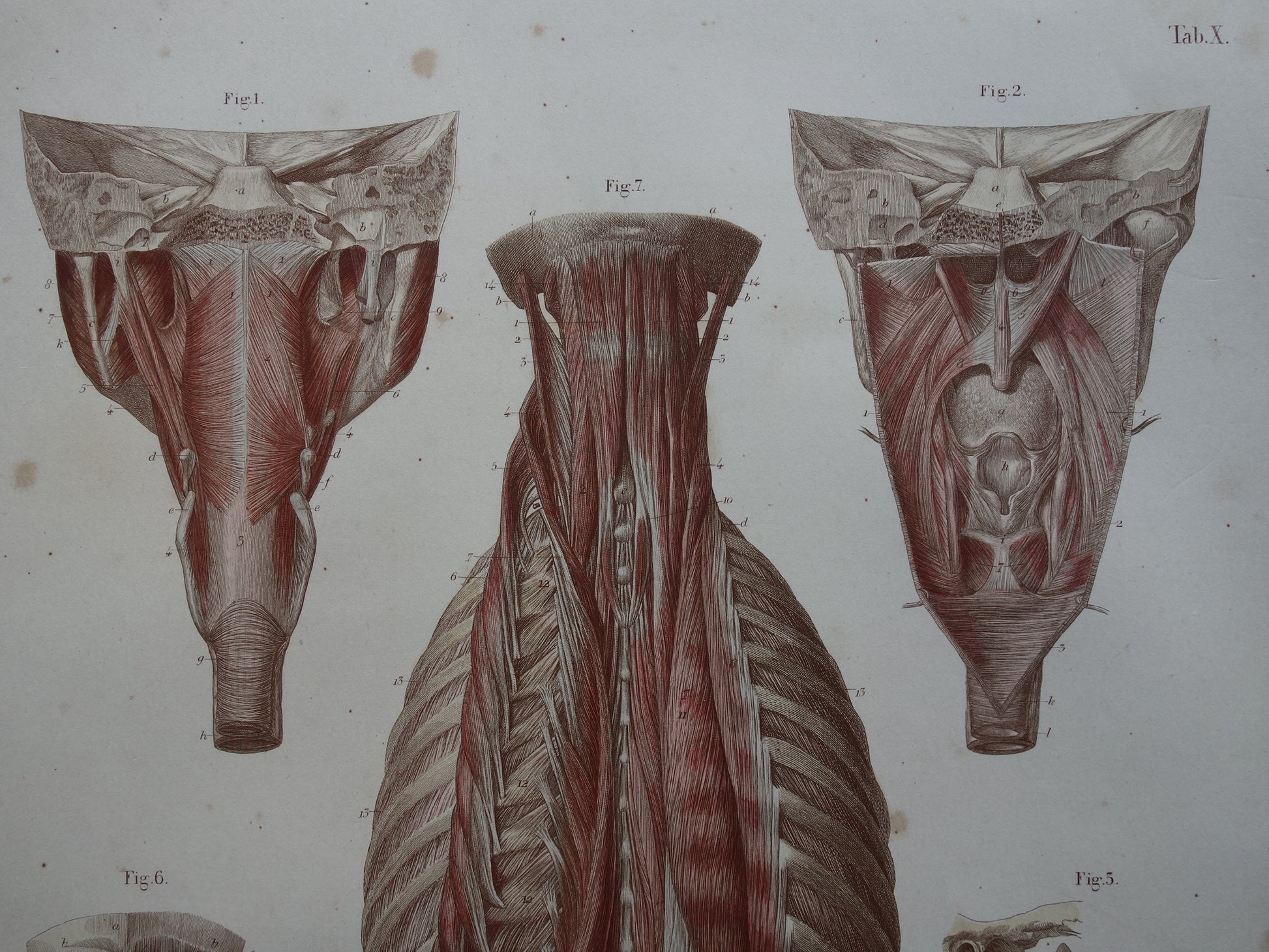 Fraaie antieke kopergravure van de spieren in nek, rug en kaak. De afbeeldingen zijn gedetailleerd, zoom de foto's om dat goed te kunnen zien.