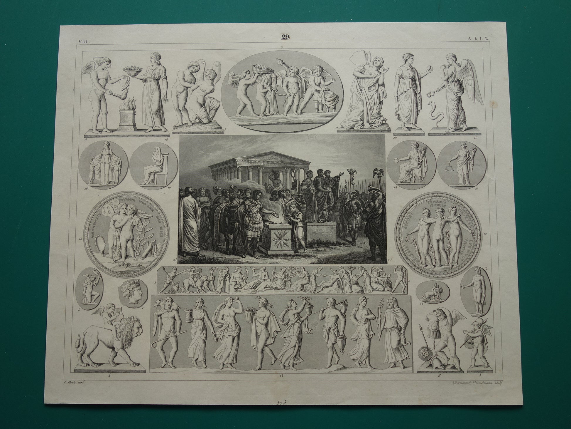 Te koop is een mooie antieke prent met 23 gedetailleerde afbeeldingen met betrekking tot Griekse en Romeinse goden. Zoom in op de foto's om alle details te zien. De centrale afbeelding van de prent gaat over een offer gebracht door Romeinen. Op de laatste foto staat de index van wat er afgebeeld is (o.a. Amor Eros). Deze is in oud Duits frakturschrift, dus niet zo gemakkelijk te lezen.