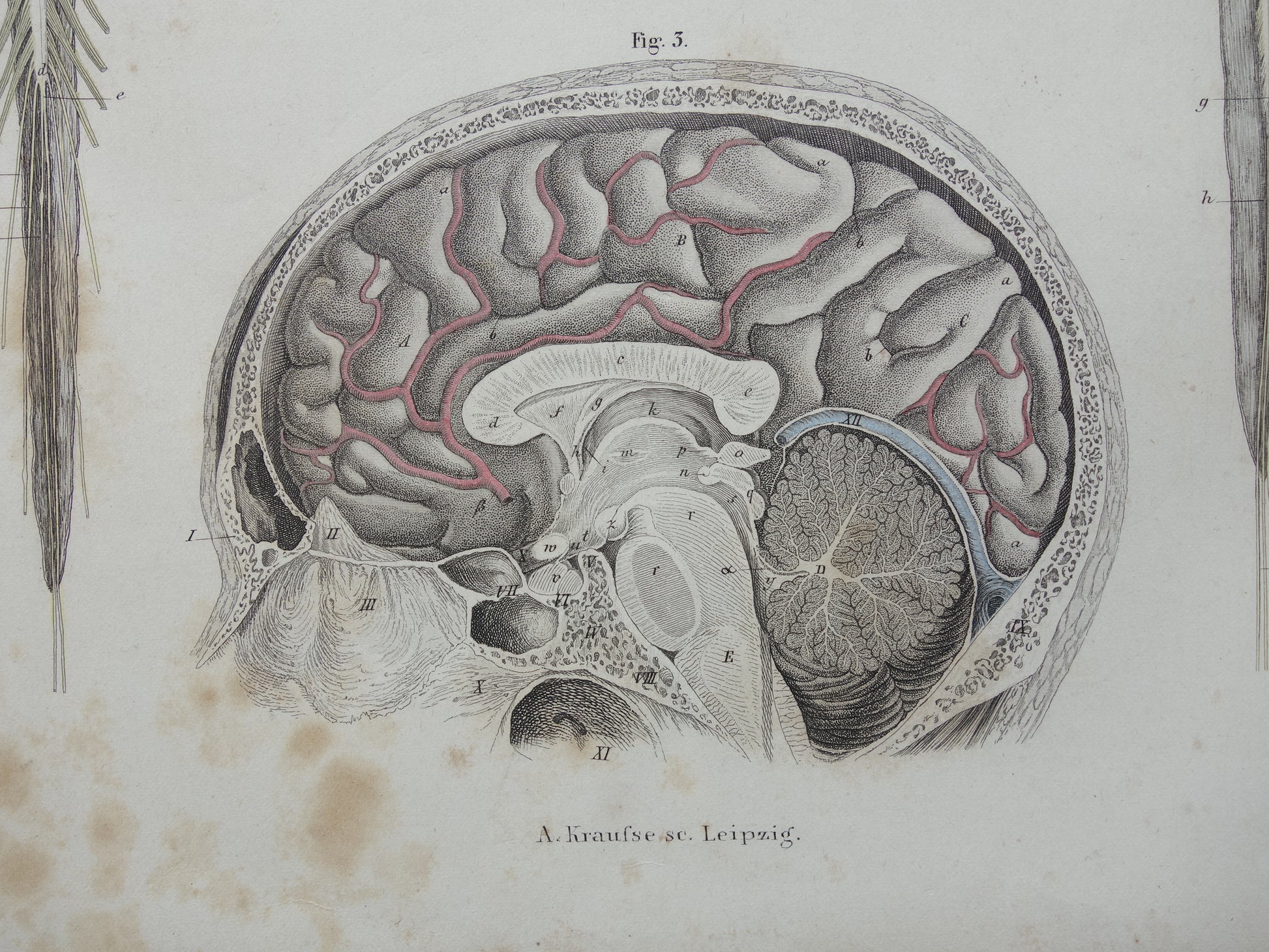 HERSENEN Oude anatomie print menselijke hersenen 1871 Antieke prent Vintage anatomische illustratie ruggenmerg