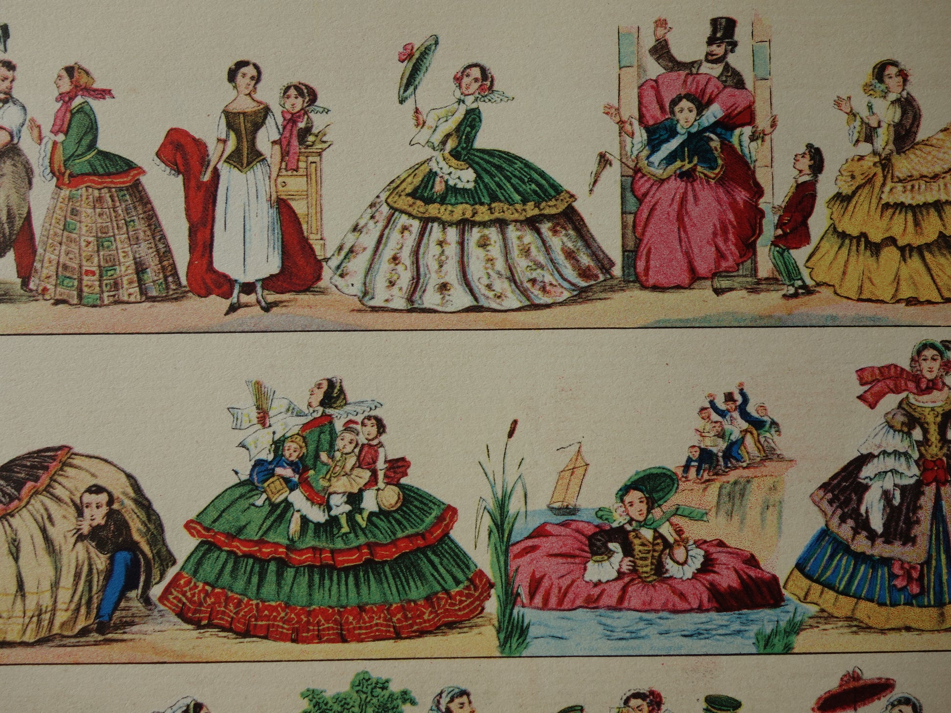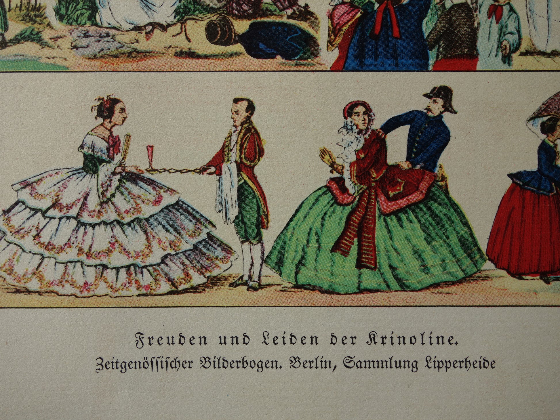 Te koop is een zeer kleurrijke oude Duitse prent over de crinoline / hoepelrok uit het jaar 1903.
