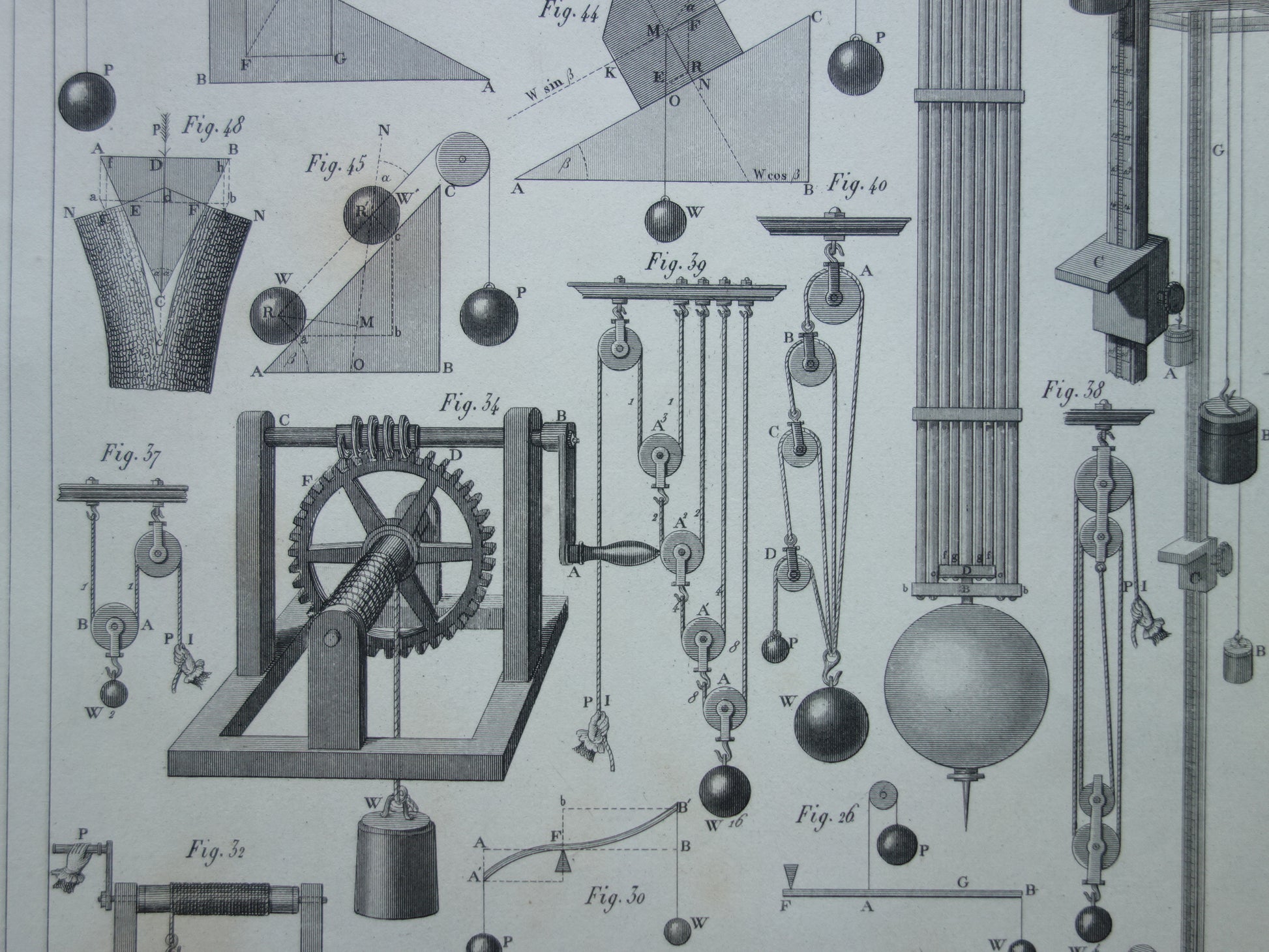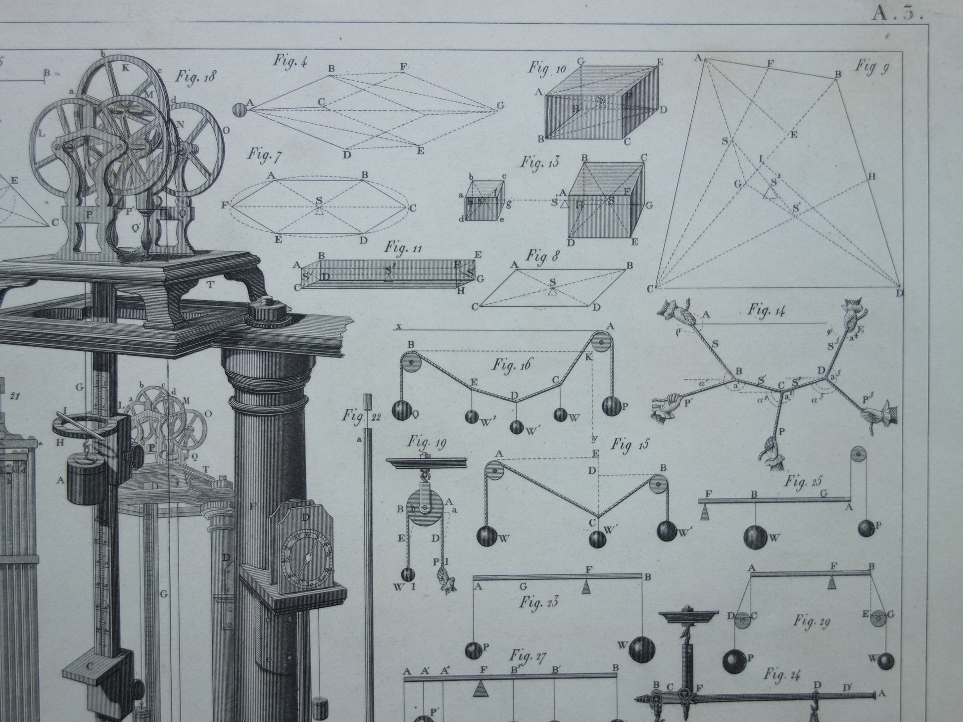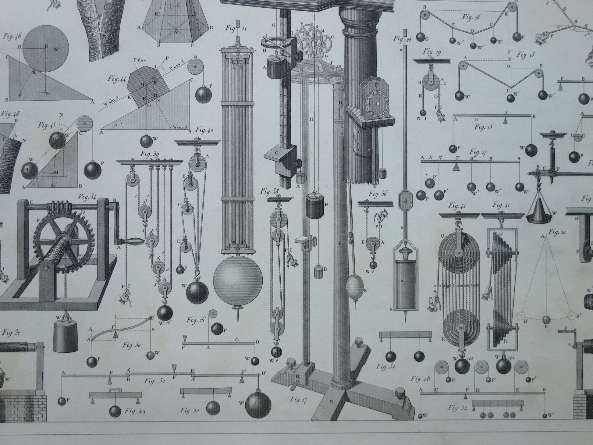 Te koop is een mooie oude prent met daarop gedetailleerde afbeeldingen van katrollen en andere instrumenten gebruikt bij natuurkundige experimenten.