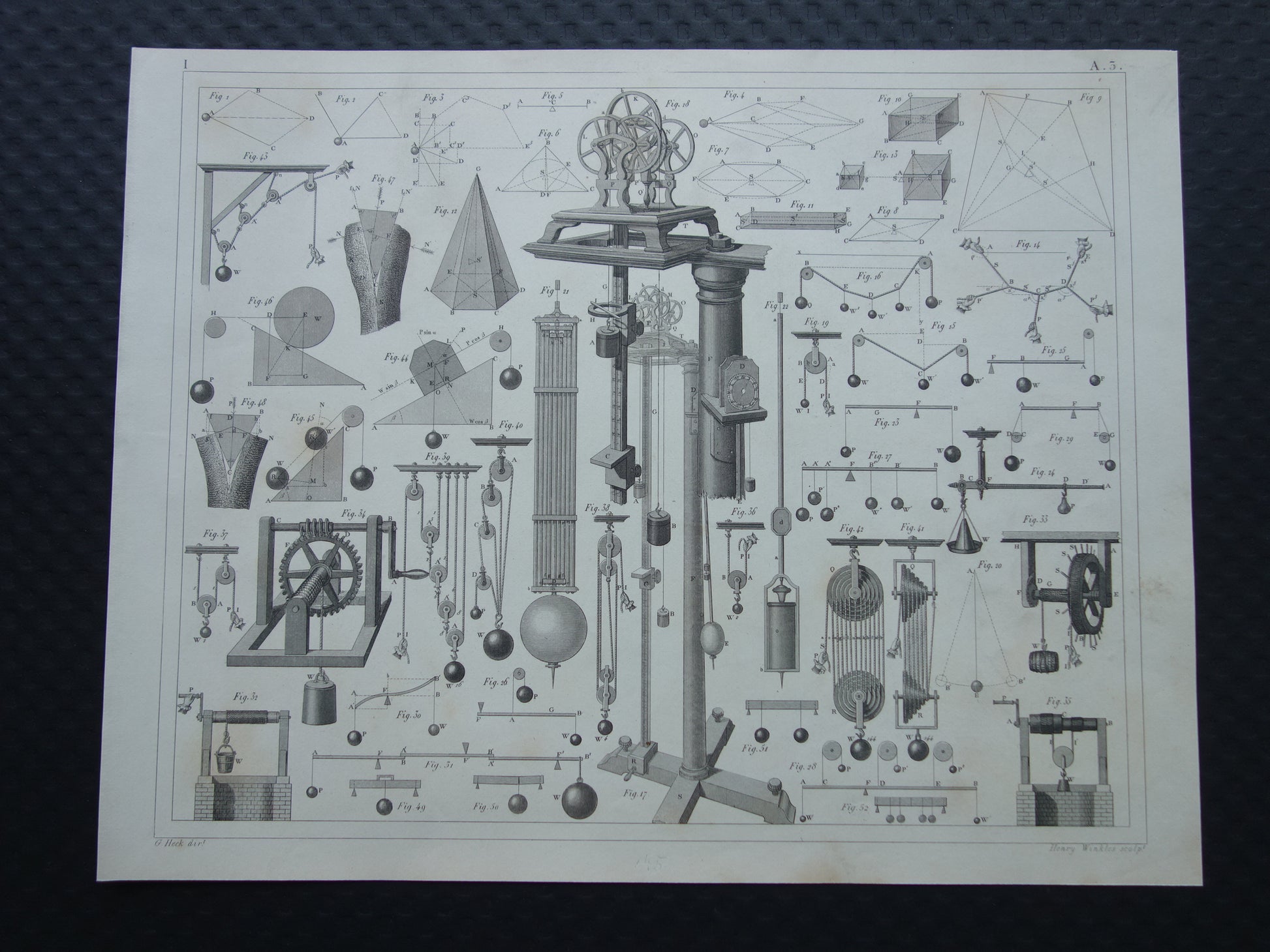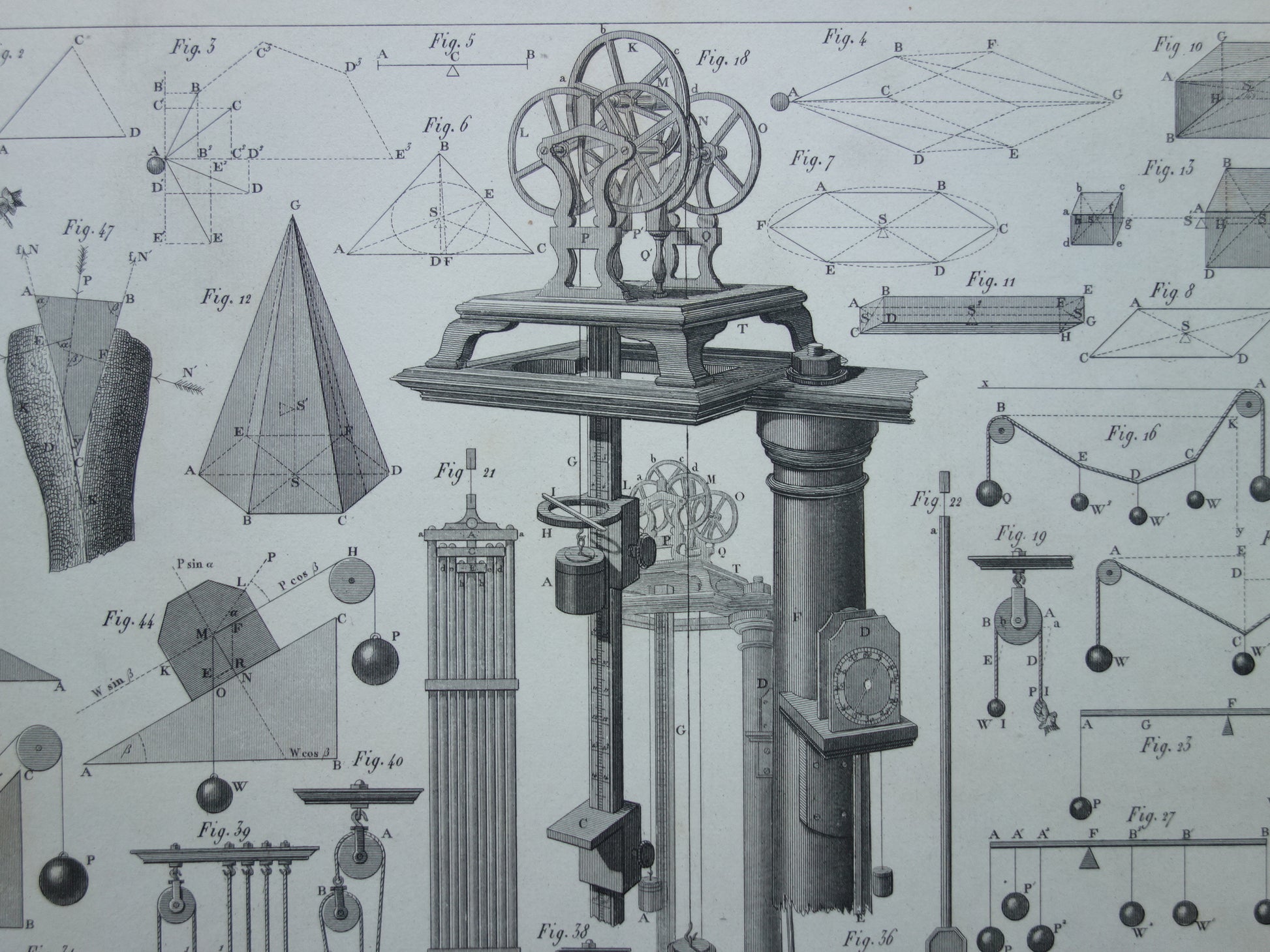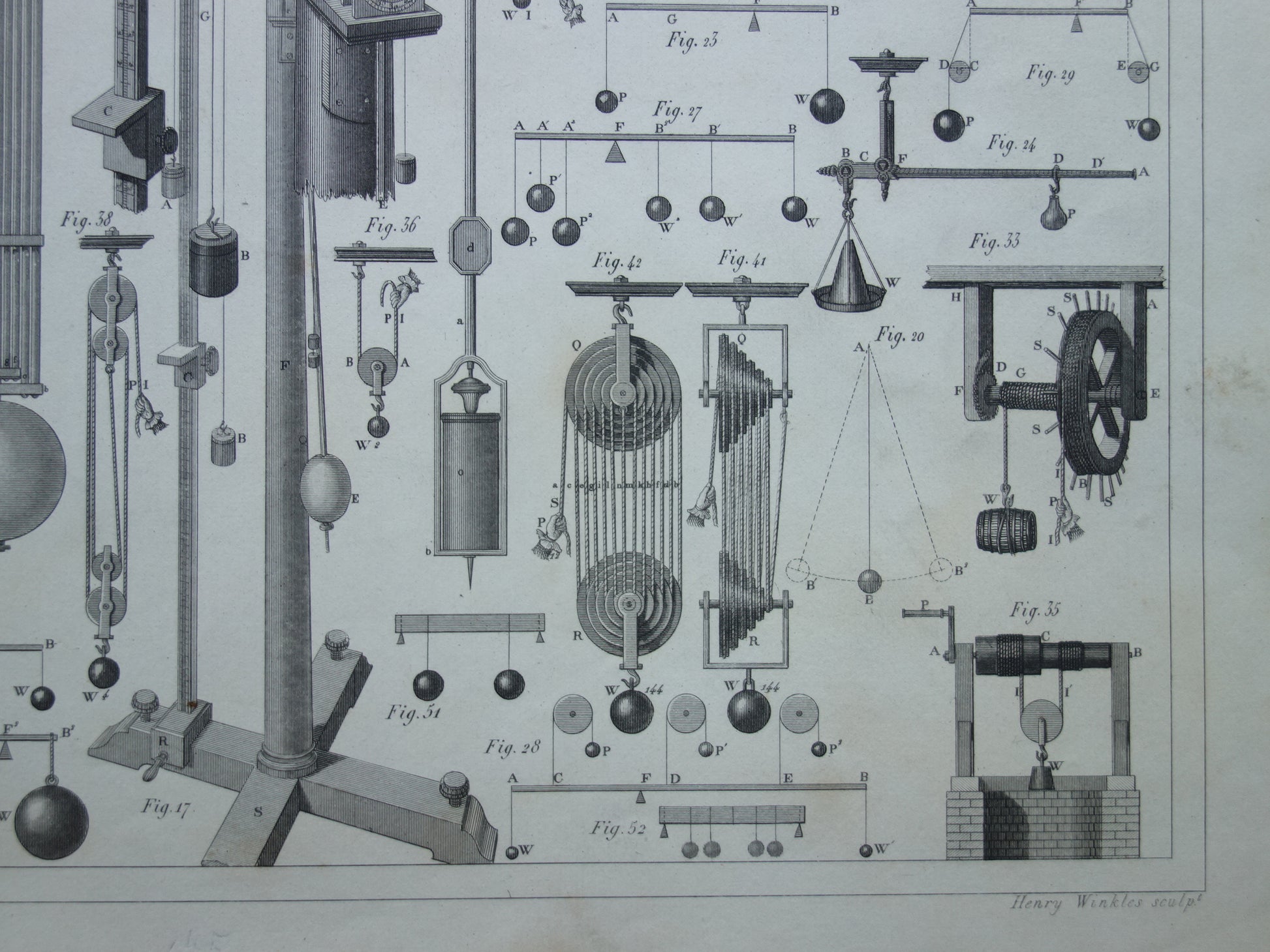Te koop is een mooie oude prent met daarop gedetailleerde afbeeldingen van katrollen en andere instrumenten gebruikt bij natuurkundige experimenten.
