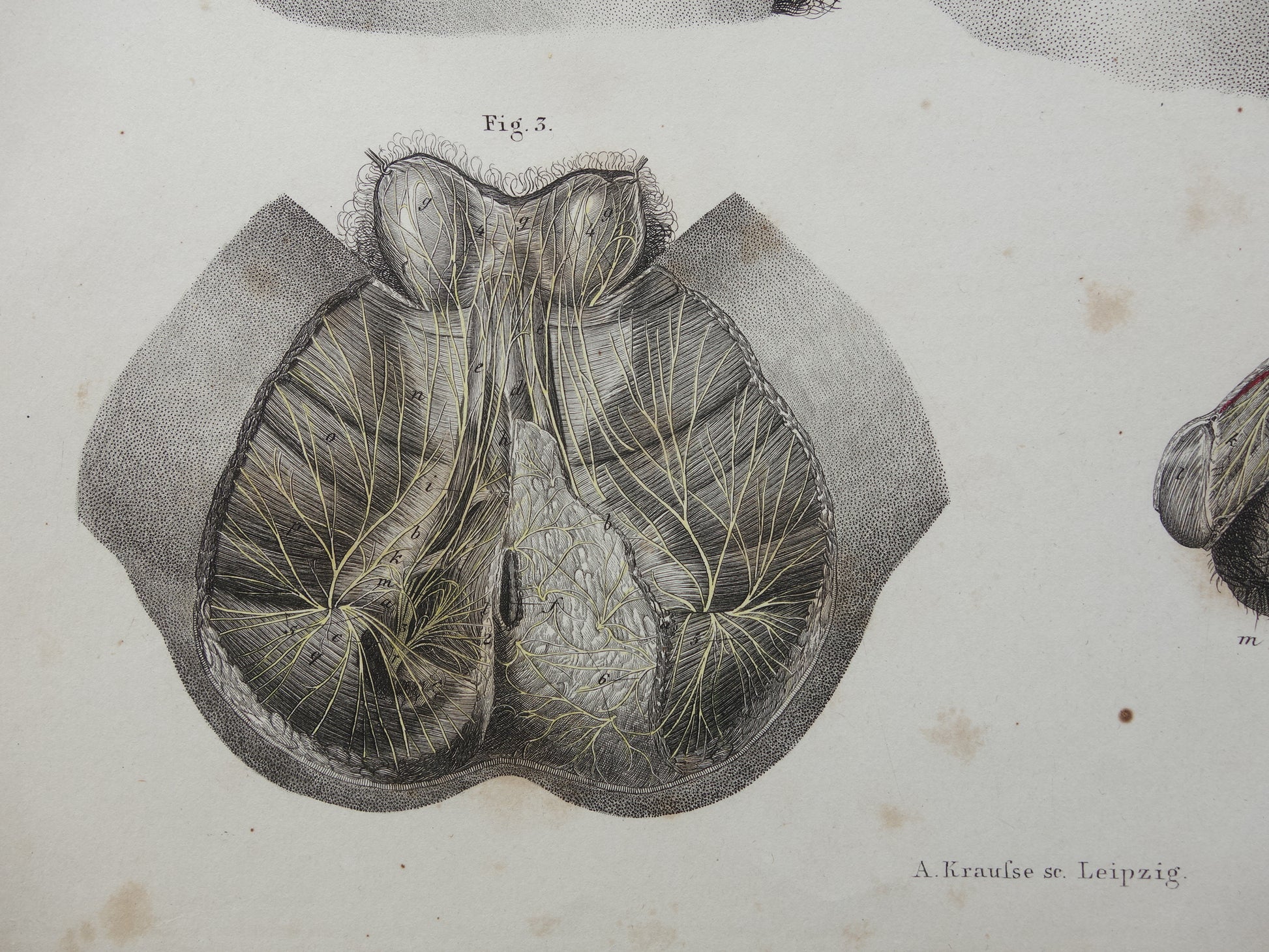 Fraaie antieke kopergravure van de zenuwen in de romp, gezien van achteren, opzij en van onderen. De afbeeldingen zijn gedetailleerd, zoom de foto's om dat goed te kunnen zien.