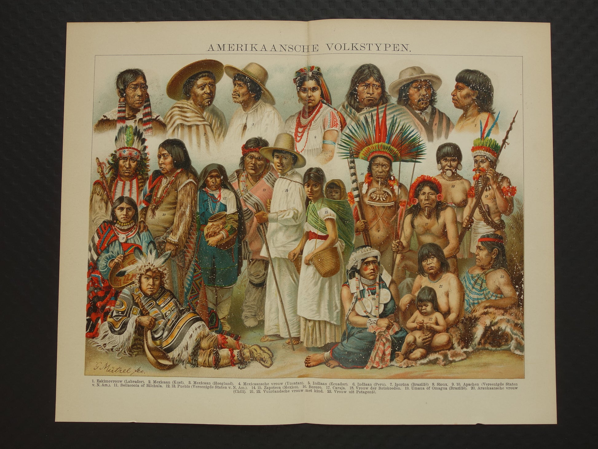 Te koop is een oude Nederlandse prent met daarop afbeeldingen van verschillende oorspronkelijke bewoners van Amerika.