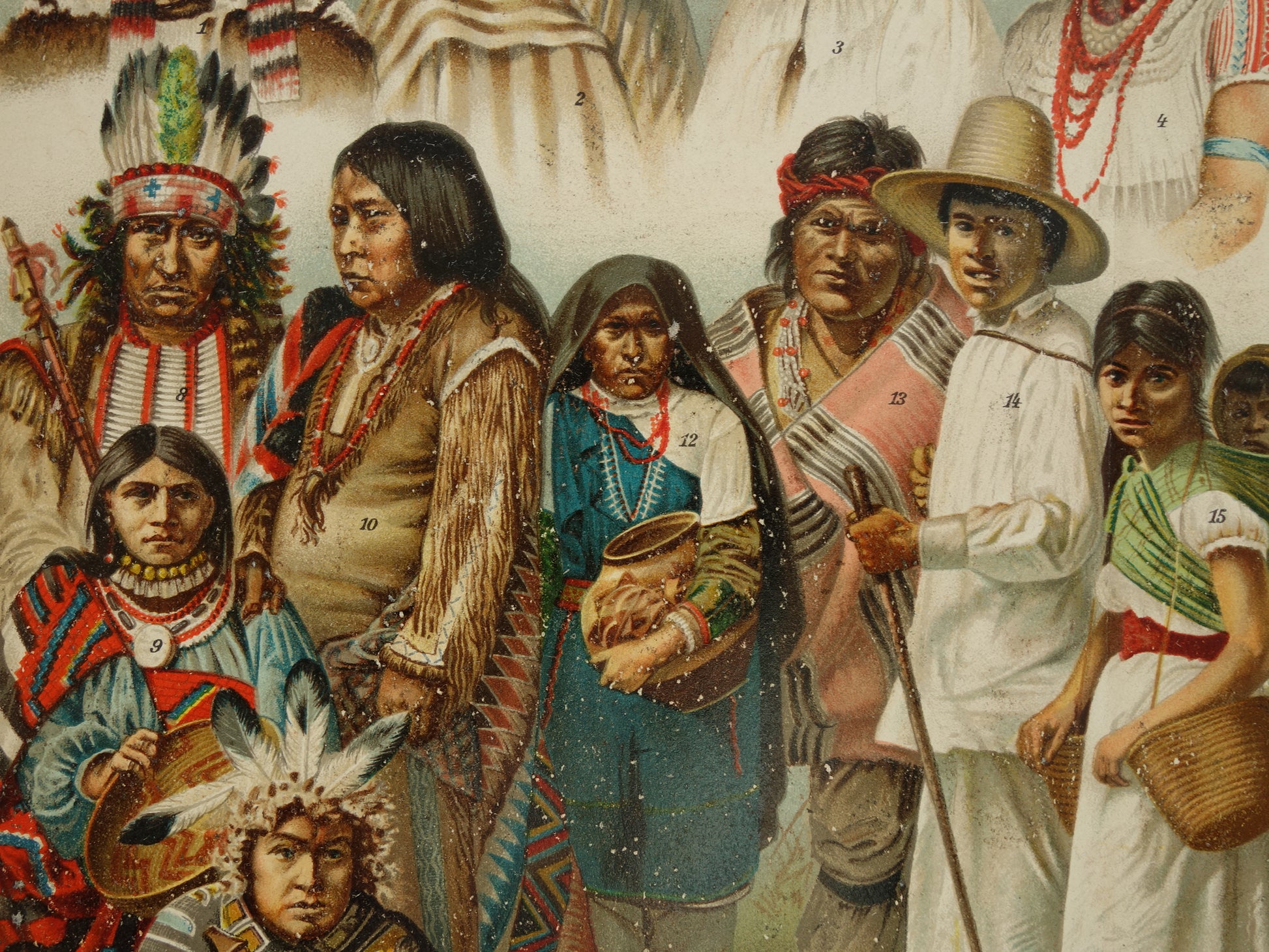 Oude prent van Indianen Antieke illustratie oorspronkelijke bewoners Amerika Antropologie Etnografie
