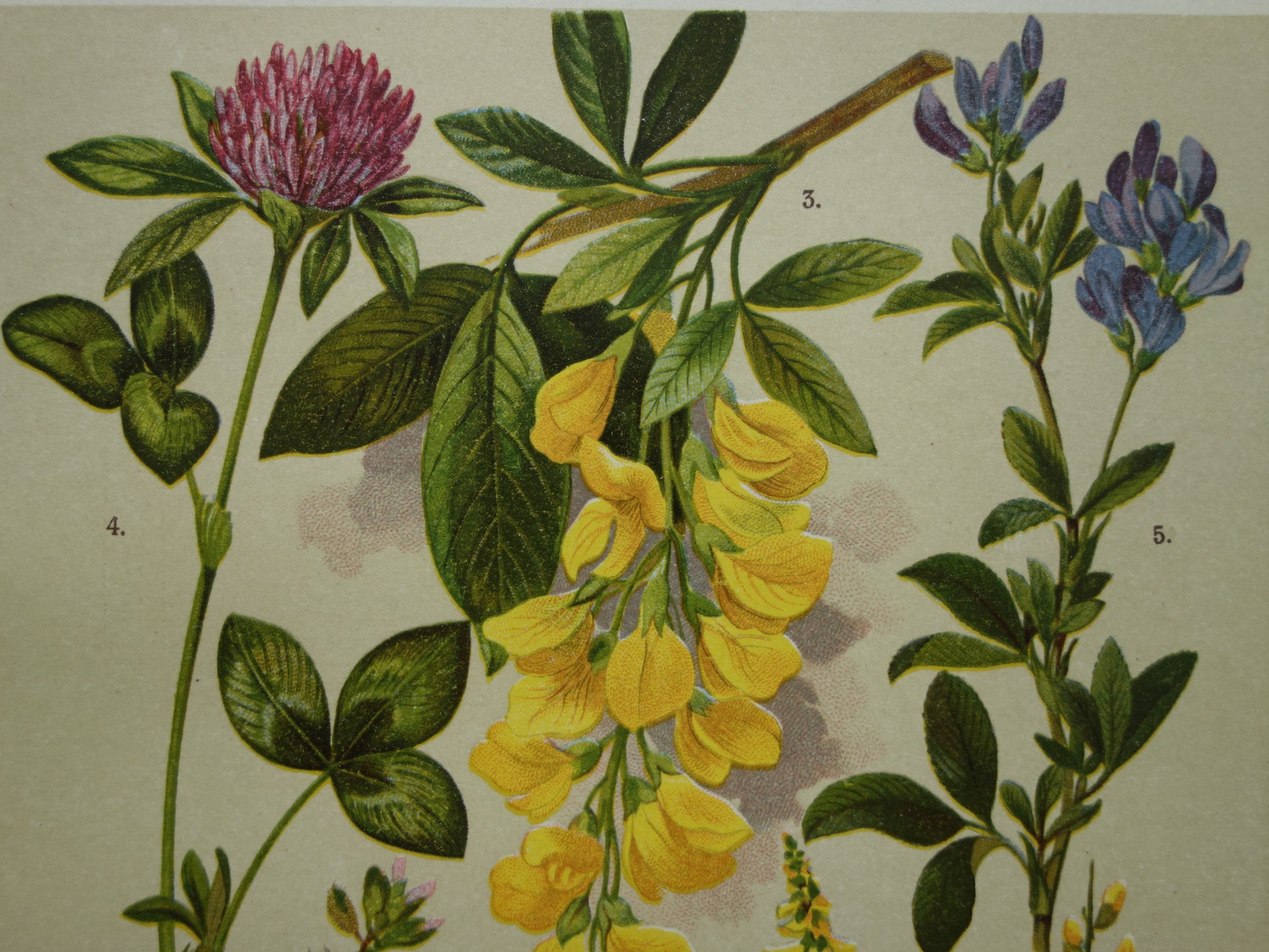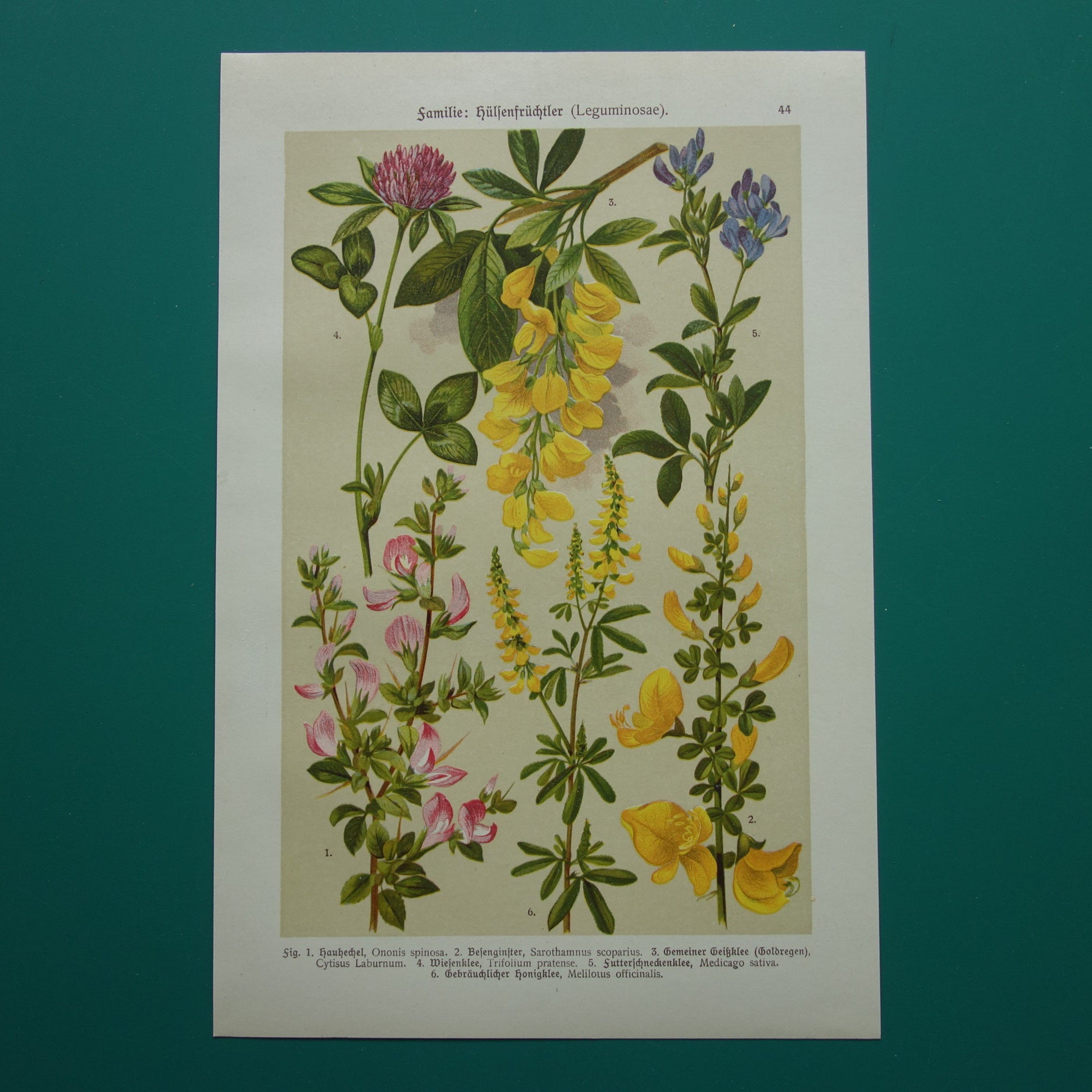 Te koop is een mooie oude Duitse botanische prent met afbeeldingen van onder andere Goudenregen, Brem en Kattendoorn. Zie de index onderaan de prent om te zien welke andere bloemen staan afgebeeld. Gedrukt op stevig papier met ruime marges en dus heel geschikt om in te lijsten.